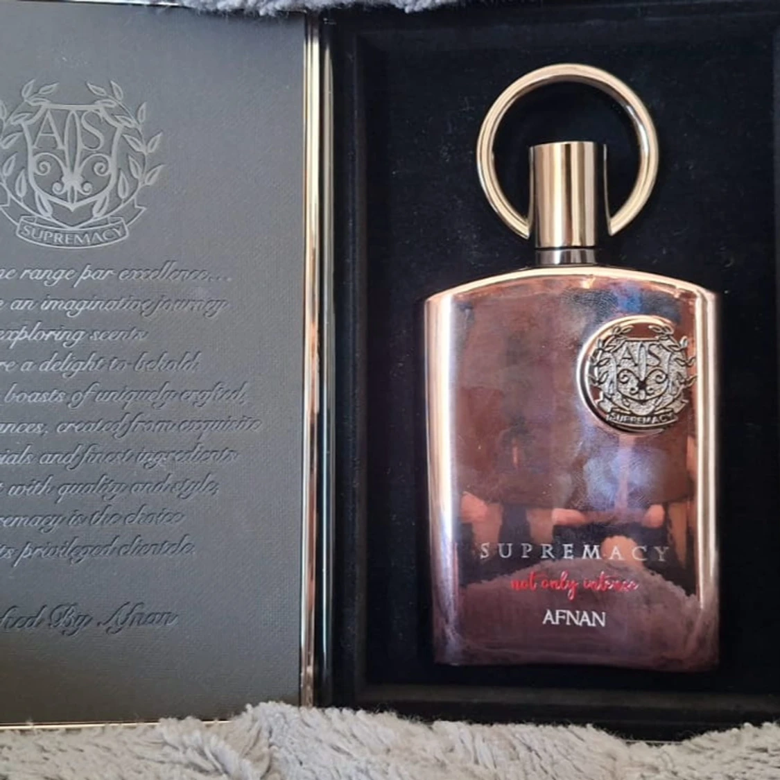 Lyxig parfym från Afnan i modellen Supremacy Not Only Intense. Flaskan är metallisk roséguld med rundad form och ett stort runt lock. Levereras i elegant presentask med logotyp och detaljerad gravyr. Perfekt för dig som gillar exklusiva dofter och snygg design.