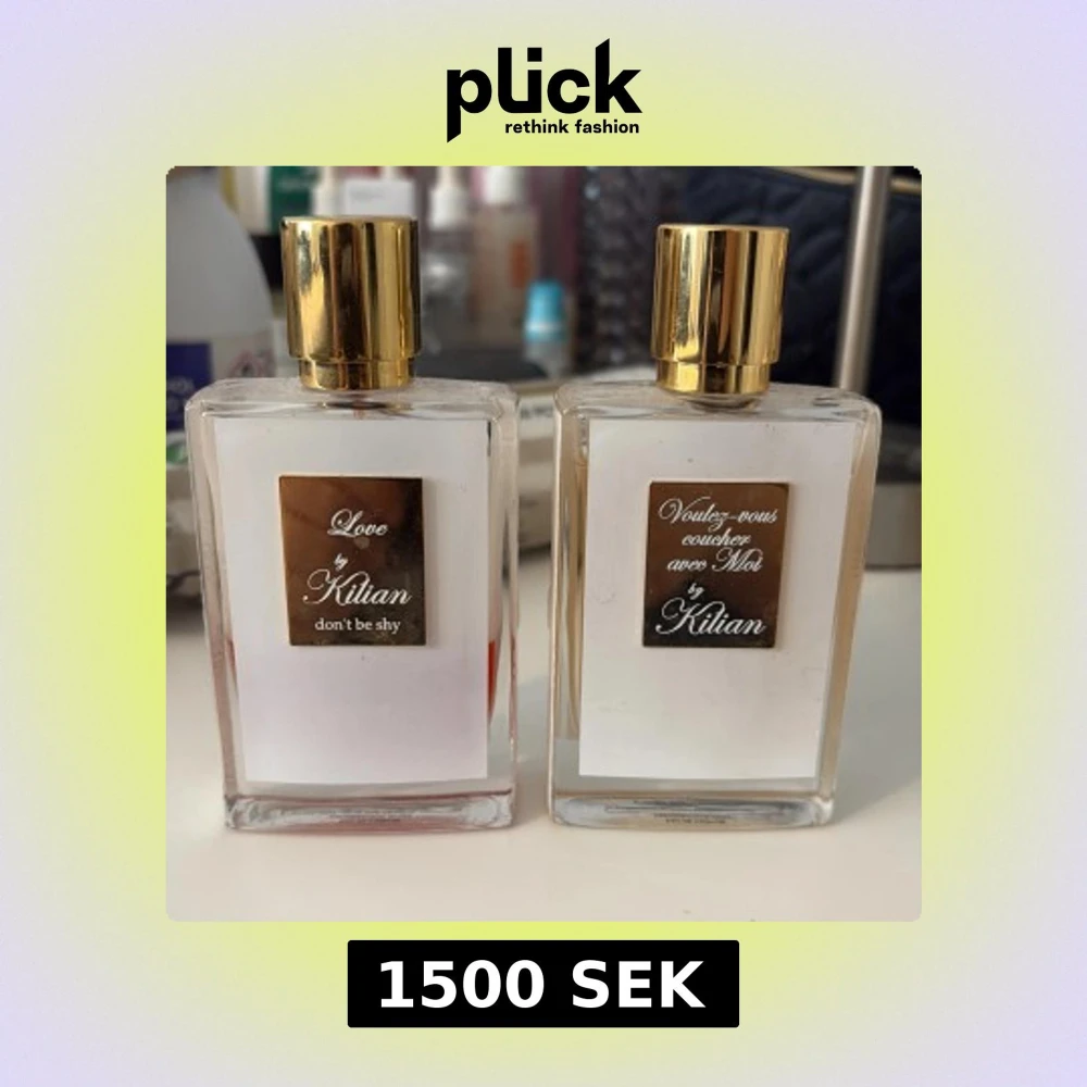 Två eleganta parfymflaskor från By Kilian med guldfärgade lock och etiketter. Den ena flaskan är märkt 'Love, don't be shy' och den andra 'Voulez-vous coucher avec Moi'. Flaskorna har en stilren och lyxig design med genomskinligt glas som visar vätskan inuti.