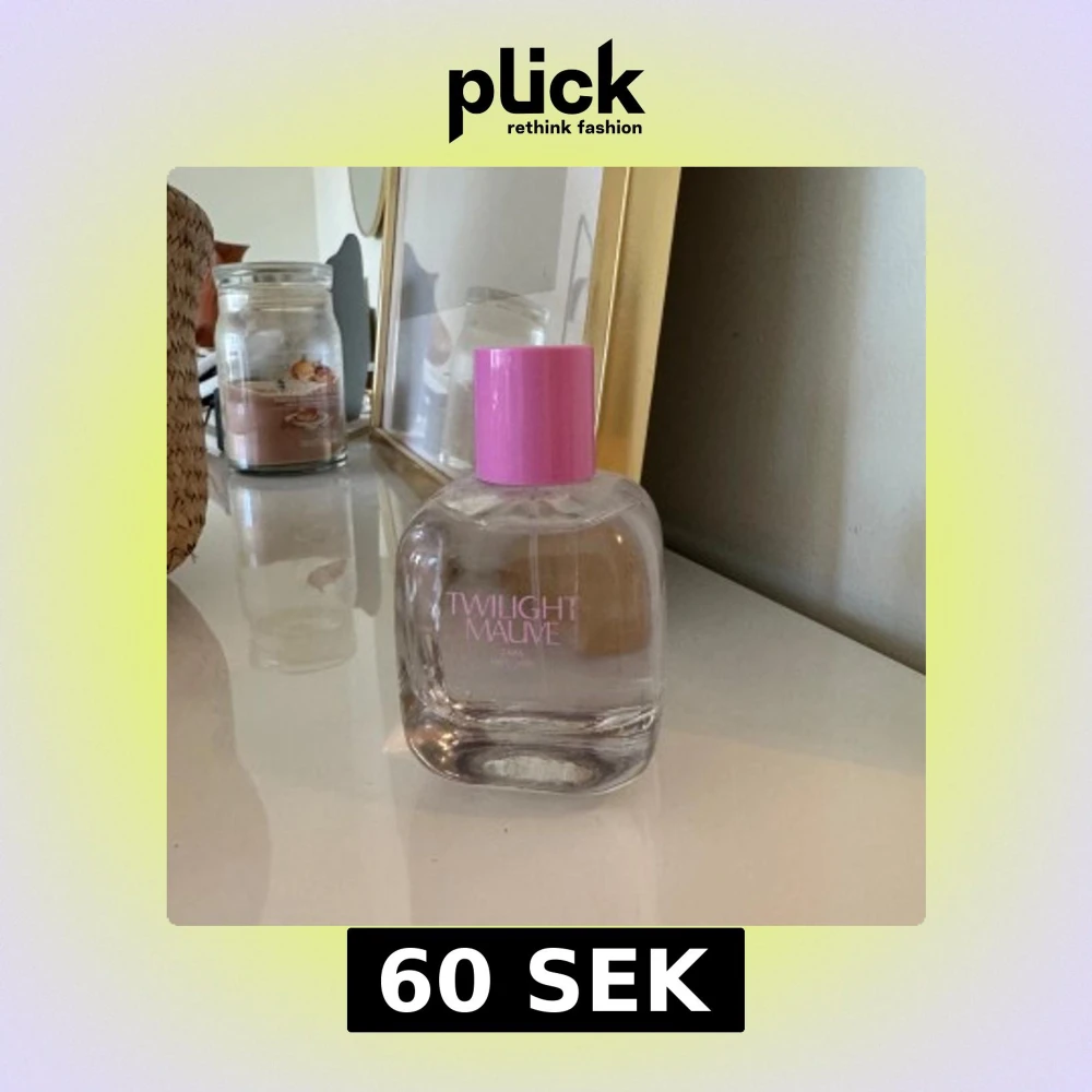 Säljer en elegant parfymflaska från Twilight Mauve. Flaskan är genomskinlig med en ljusrosa kork och text. Perfekt för den som älskar en subtil och fräsch doft. Flaskan har en stilren och modern design som passar fint på sminkbordet.