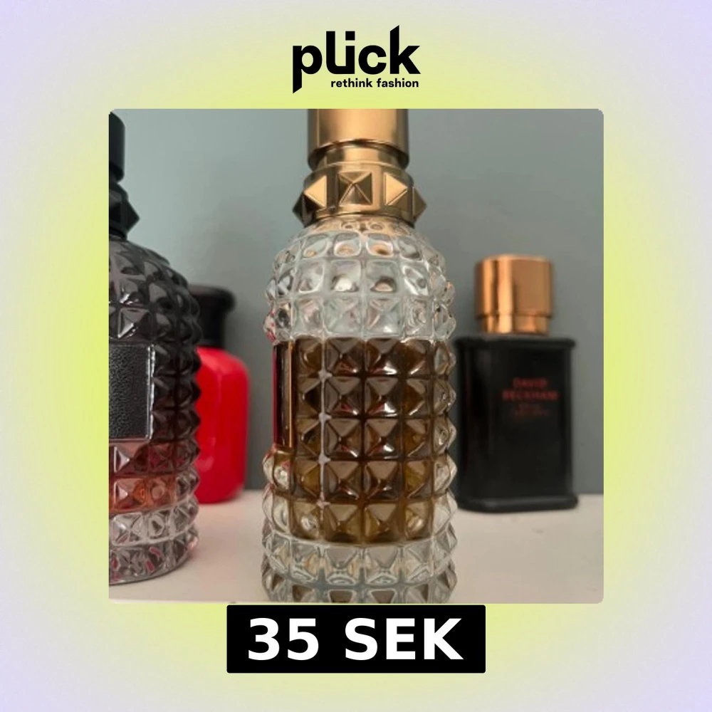 Elegant parfymflaska med ett unikt mönster av nitar och en gyllene kork. Flaskan har en transparent design som visar den bärnstensfärgade vätskan inuti. Perfekt för den som vill ha en stilfull och iögonfallande parfym på hyllan.