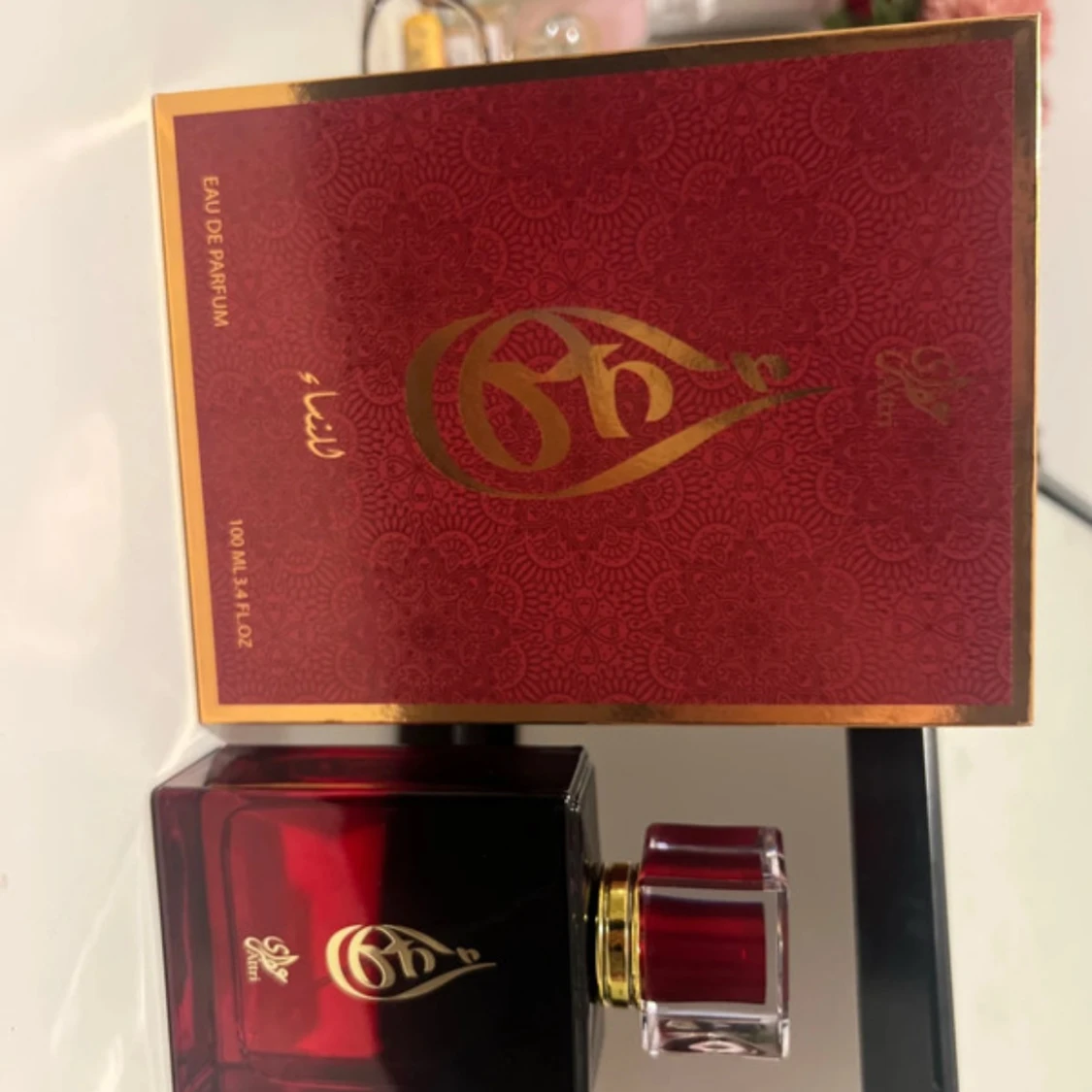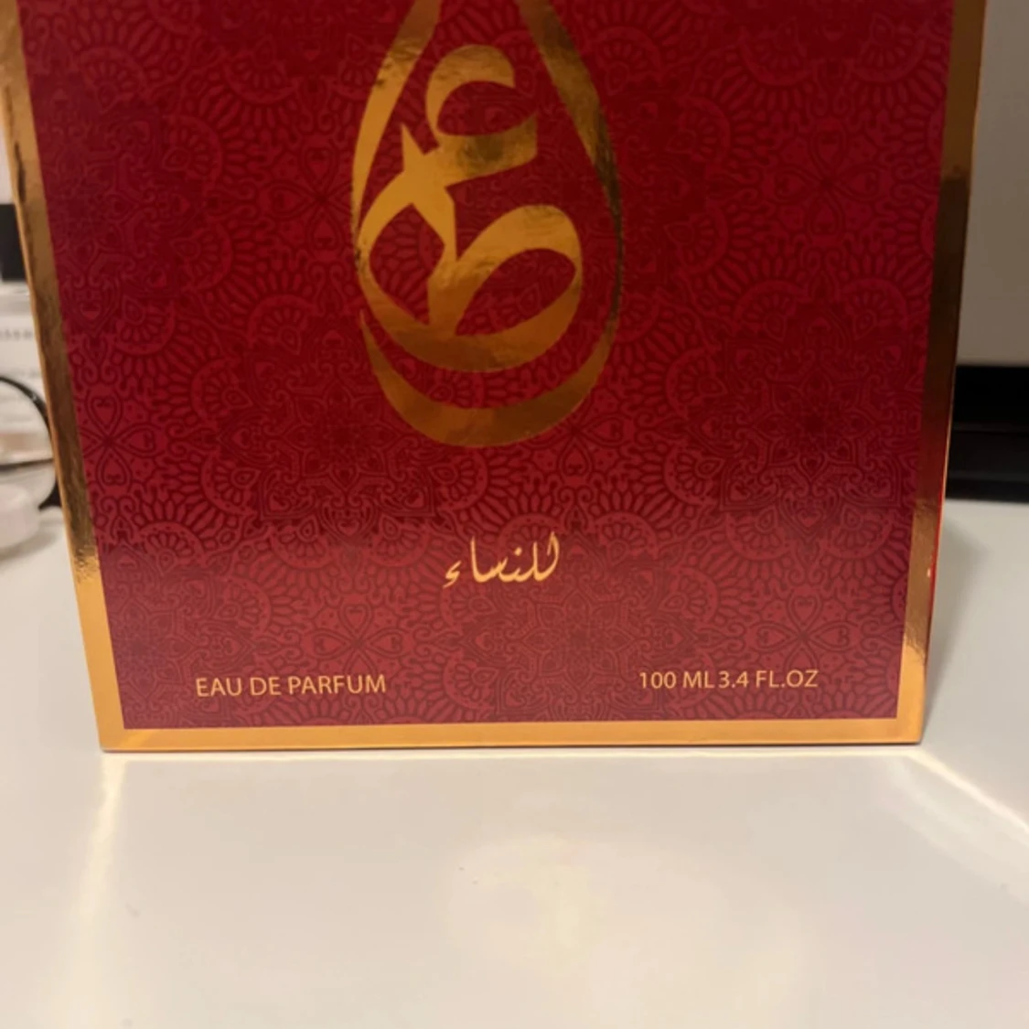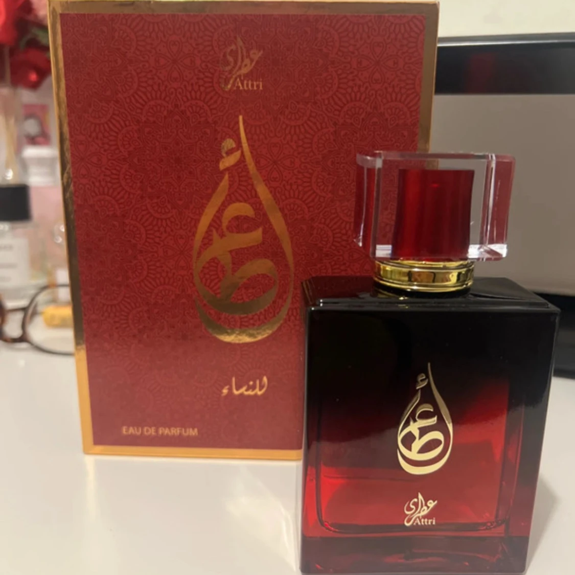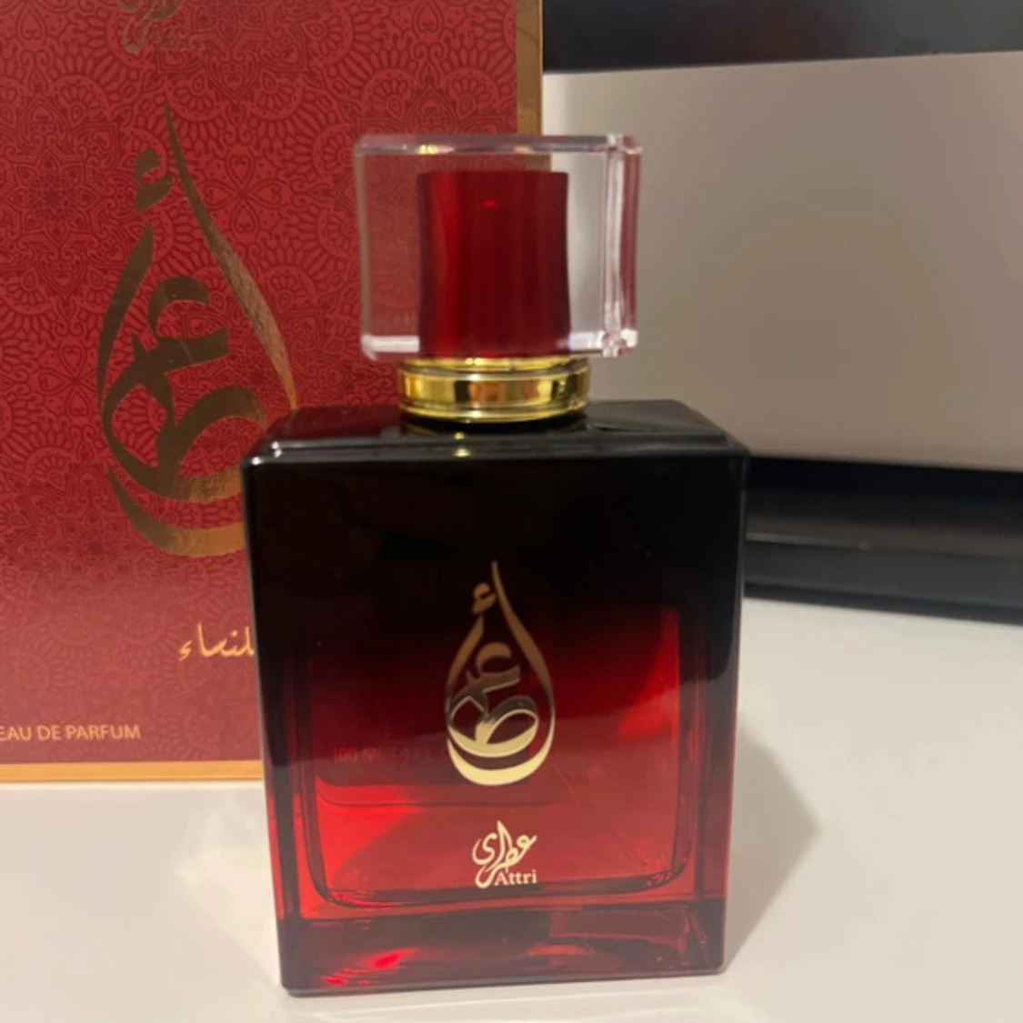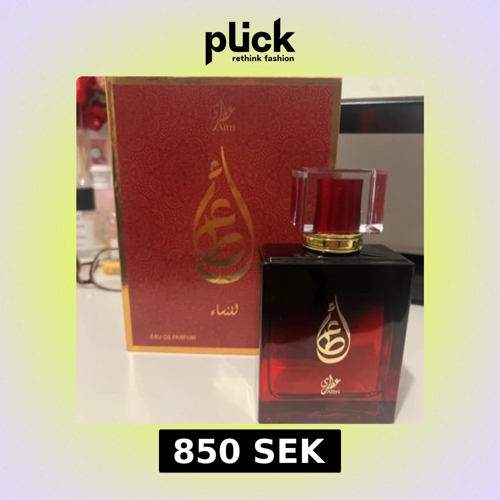 Lyxig parfym från Attri i en elegant röd glasflaska med guldiga detaljer och genomskinlig röd kork. Kommer i en snyggt mönstrad röd och guld ask. Flaskan rymmer 100 ml Eau de Parfum och har en exklusiv känsla med arabisk design. Köpt från Dubai och medtagen. En oud doft som får folk att vända sig om för att fråga vad du har för doft🥰🥰