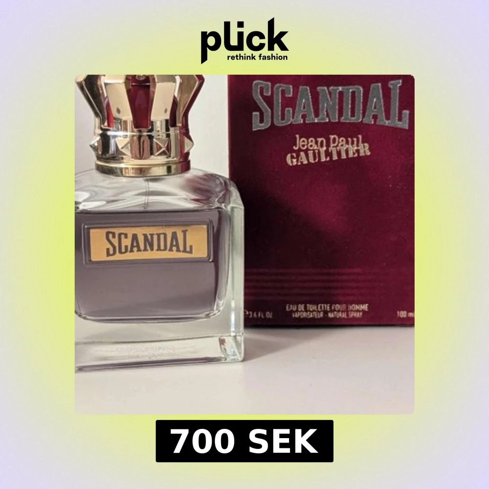 Ca 90 ml kvar Scandal Pour Homme från Jean Paul Gaultier är en eau de toilette för män. Flaskan är fyrkantig i tjockt glas med en lyxig guldfärgad krona som lock. Parfymen har en mörklila ton och etiketten är guldig med svart text. Kommer i en vinröd sammetsbox.