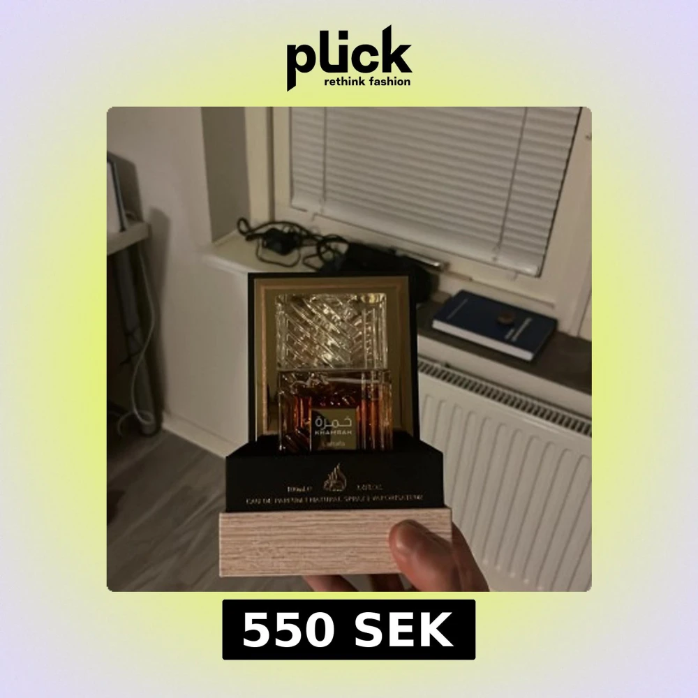 Elegant parfym från Lattafa, Khamrah, med en lyxig flaska i guld och brunt glas. Flaskan har ett intrikat mönster på korken och en stilren design. Perfekt för den som söker en sofistikerad doftupplevelse.