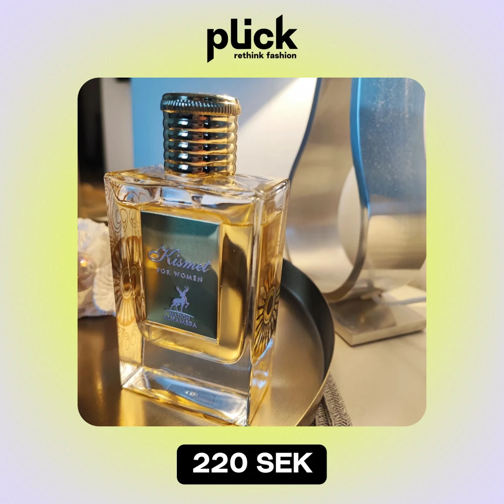 Säljer en elegant parfymflaska av Kismet for Women från Maison Alhambra. Flaskan är fyrkantig med en gyllene etikett och lock. Doften har toppnoter av aprikos, ros och jasmin, mellannoter av tuberos och narciss, samt basnoter av amber och trä. Perfekt för den som älskar blommiga och fruktiga dofter.