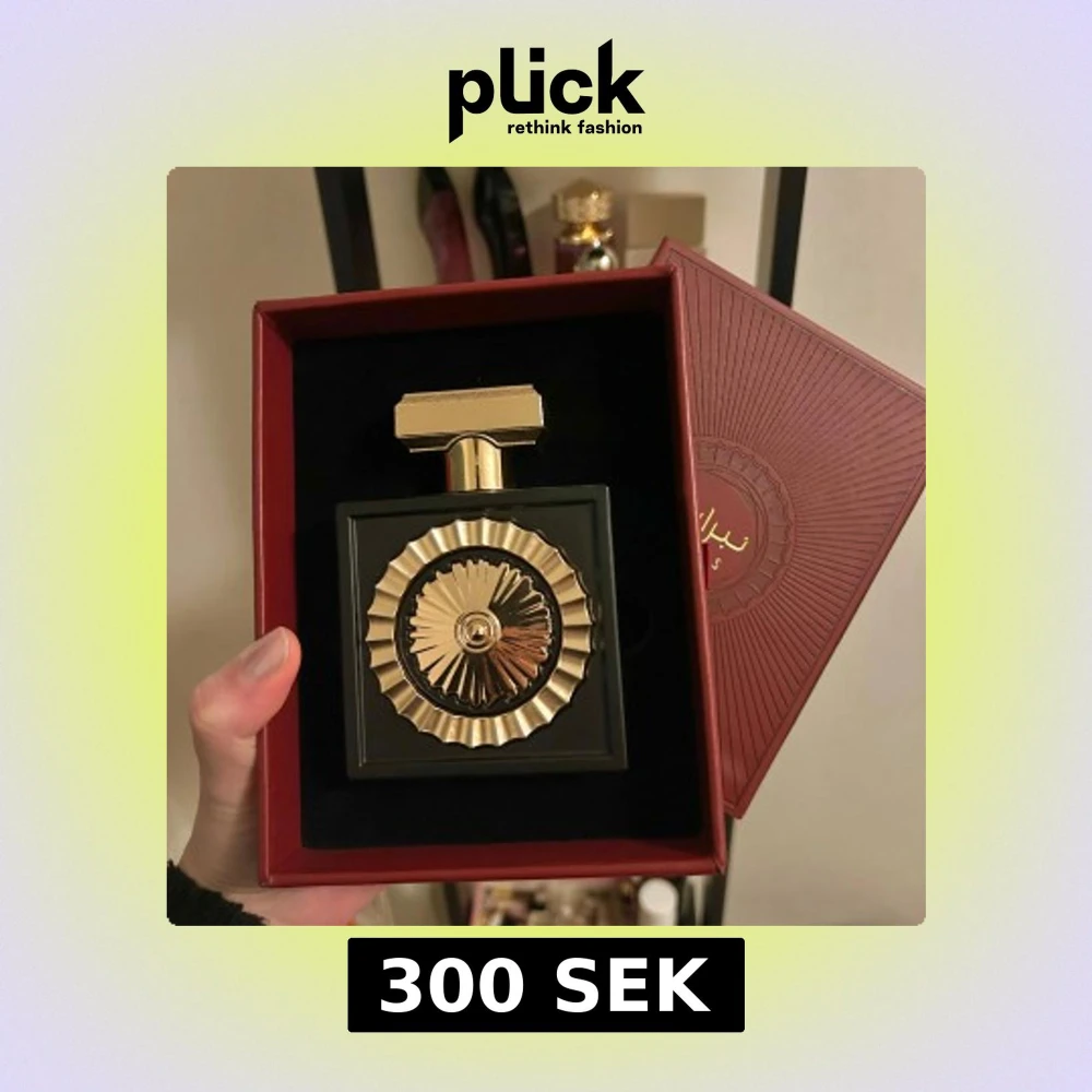 Elegant parfym från Lattafa i en lyxig svart flaska med guldiga detaljer. Flaskan har en unik design med ett dekorativt mönster och en fyrkantig guldlock. Förpackad i en stilren röd ask med guldfärgad text.