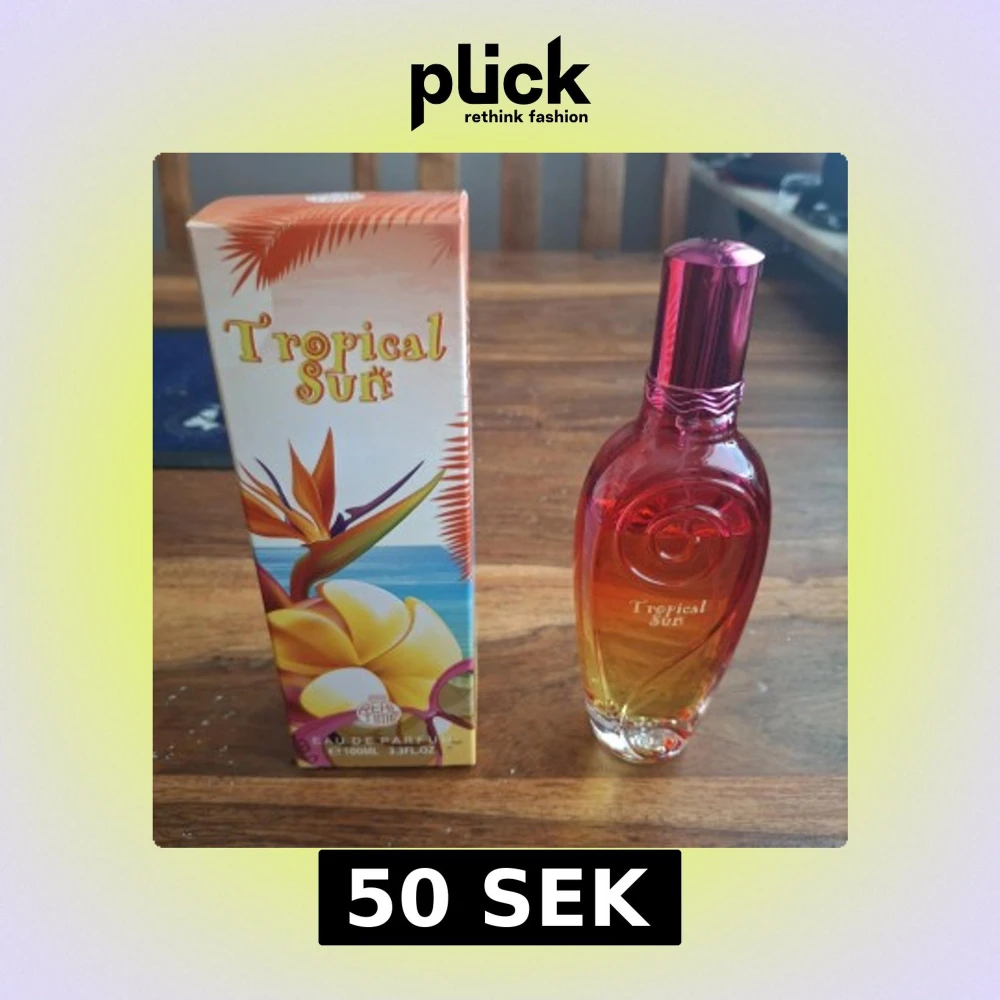 Fräsch parfym från Real Time i doften Tropical Sun. Flaskan har en snygg ombre-design i rött och gult glas med rosa lock. Förpackningen har tropiska blommor och strandmotiv. Innehåller 100ml eau de parfum.