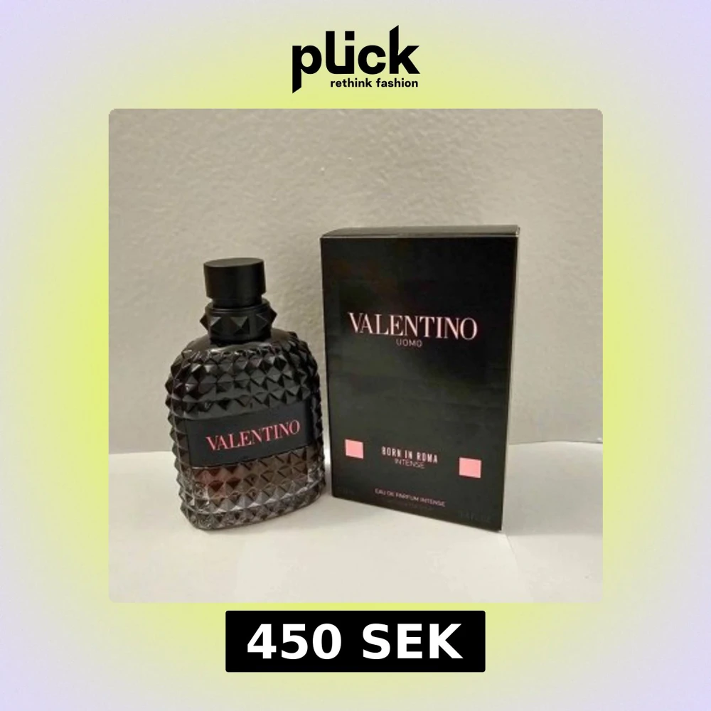 Valentino Uomo Born In Roma Intense är en lyxig herrparfym i en svart, nitar-inspirerad glasflaska med rosa detaljer. Doften kommer i en elegant svart kartong med rosa text. Flaskan har en cool, edgy design som sticker ut på hyllan.