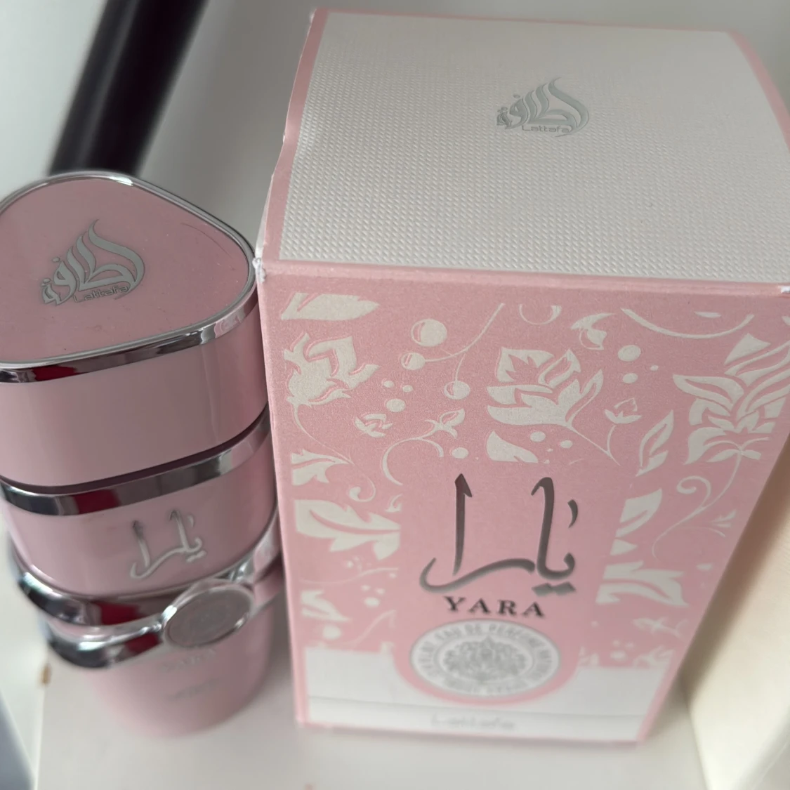 Yara är en parfym från Lattafa i en ljusrosa flaska med silverdetaljer och matchande ask. Flaskan har en unik form och arabiska inskriptioner. Doften är elegant och flaskan känns lyxig och feminin. Sprayat 2 gånger men inte min smak