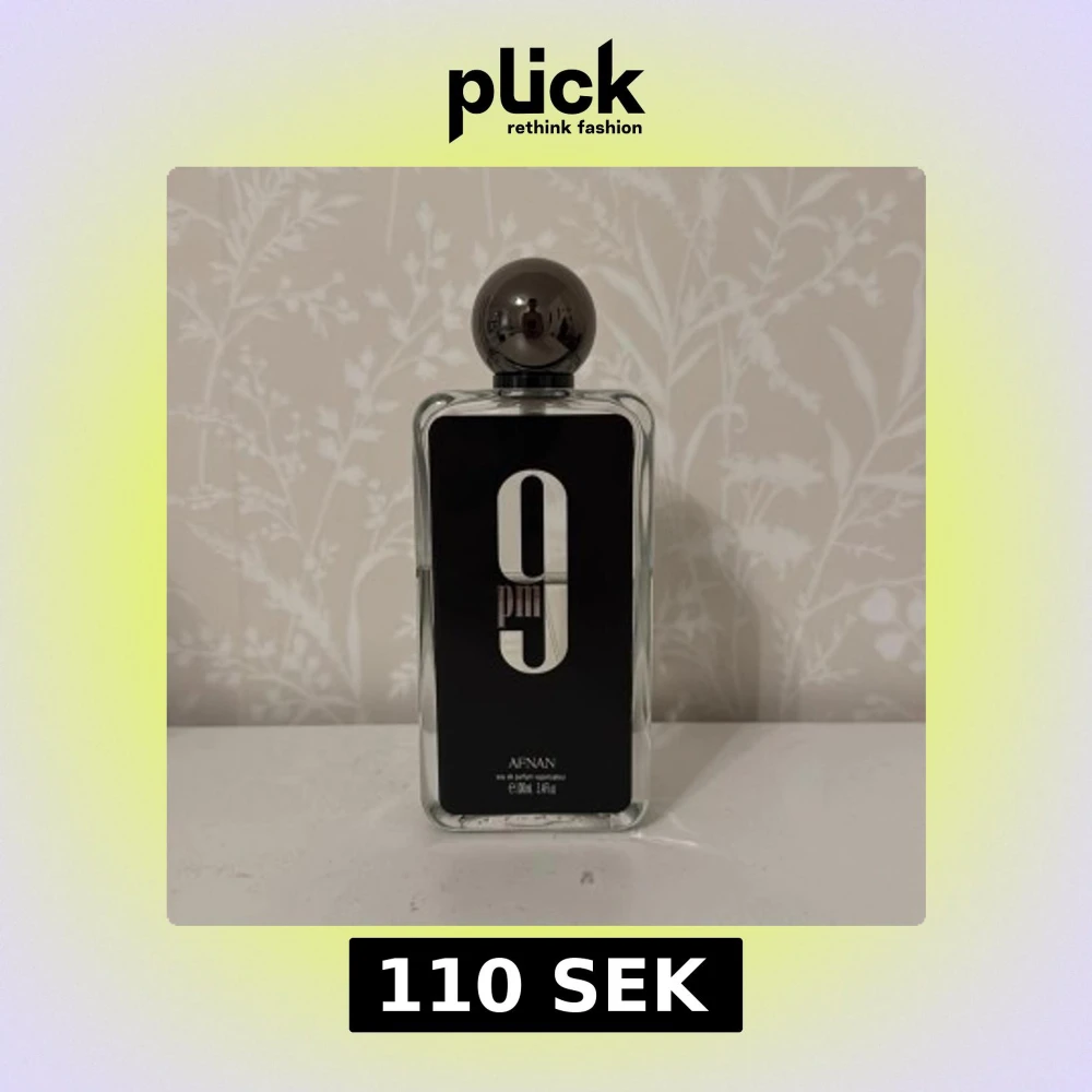 Afnan 9pm är en herrparfym i en stilren, rektangulär glasflaska med svart etikett och stor silverfärgad rund kork. Flaskan rymmer 100 ml och har en modern, minimalistisk design med siffran 9 i vitt på framsidan.