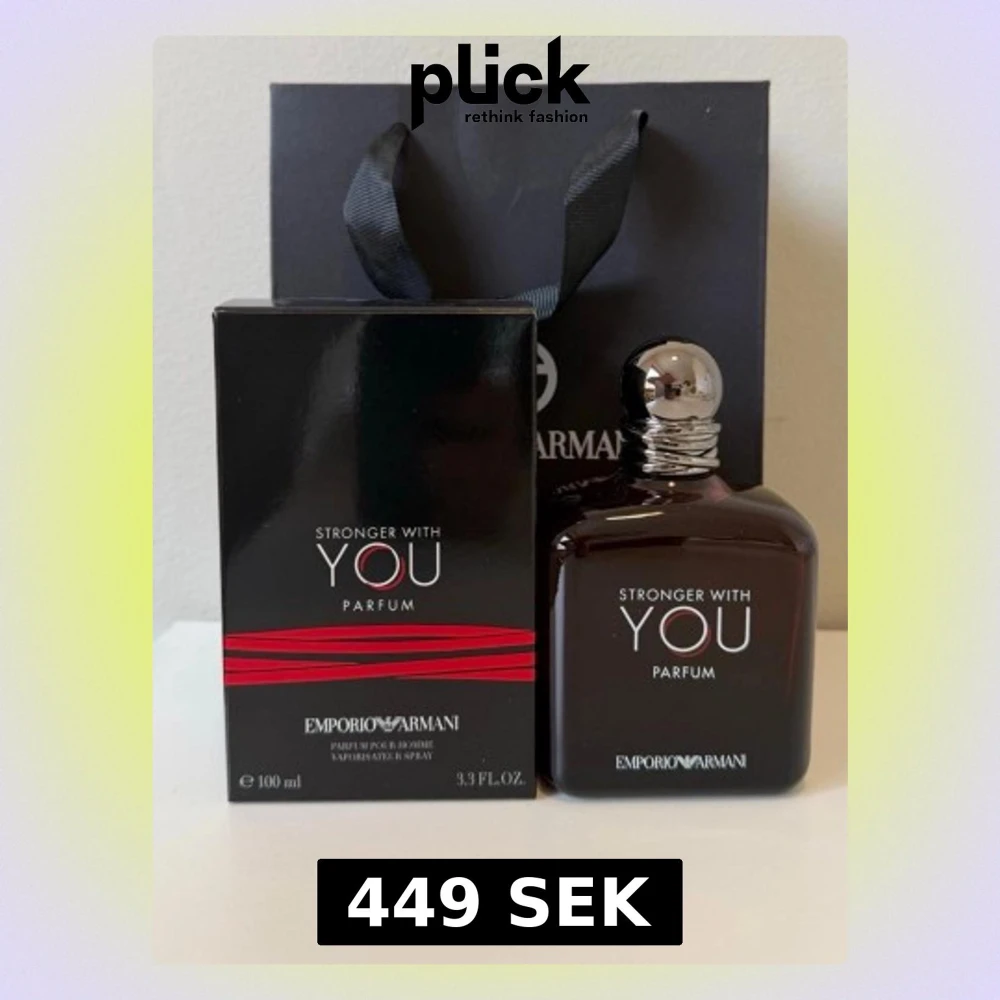 Emporio Armani Stronger With You Parfum är en elegant herrdoft i en mörkbrun glasflaska med silverfärgad kork. Flaskan rymmer 100 ml och har en stilren design med vita och röda detaljer på förpackningen. Parfymen utstrålar lyx och modernitet.