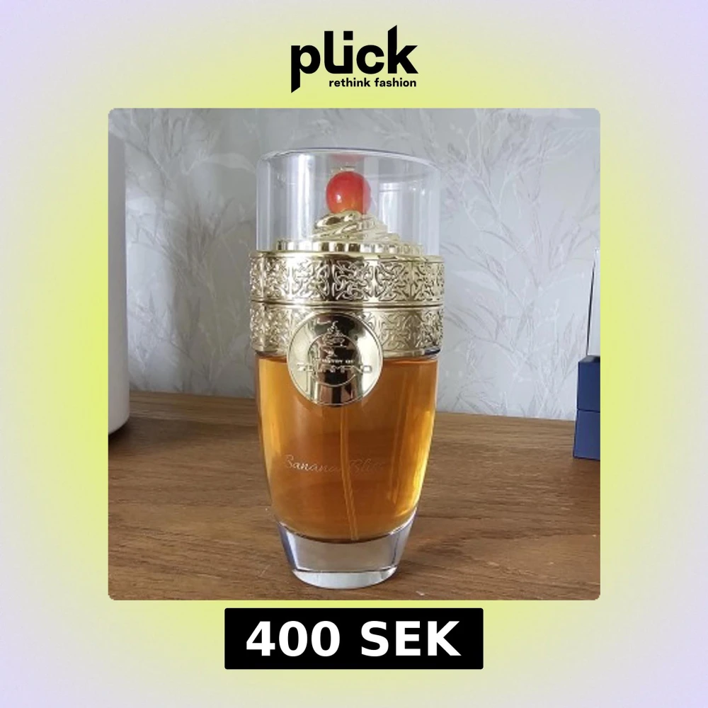 Banana Bliss parfym från Paris Corner i en lyxig glasflaska med gulddetaljer och ett rött körsbär på toppen. Flaskan har ett elegant mönster i guldfärgad metall och genomskinligt lock. Doften är exotisk och unik, perfekt för dig som vill sticka ut. Endast provsprejad.