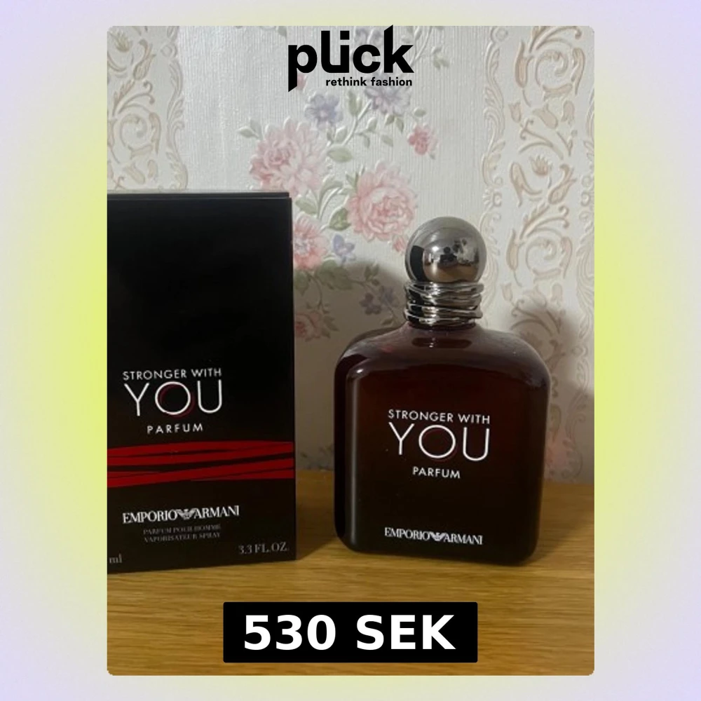 Emporio Armani Stronger With You Parfum i en elegant mörkbrun glasflaska med rundade kanter och en silverfärgad metallkork. Flaskan har stilren vit text och kommer med en svart kartong med röda detaljer. En lyxig doft för dig som gillar exklusiva parfymer.