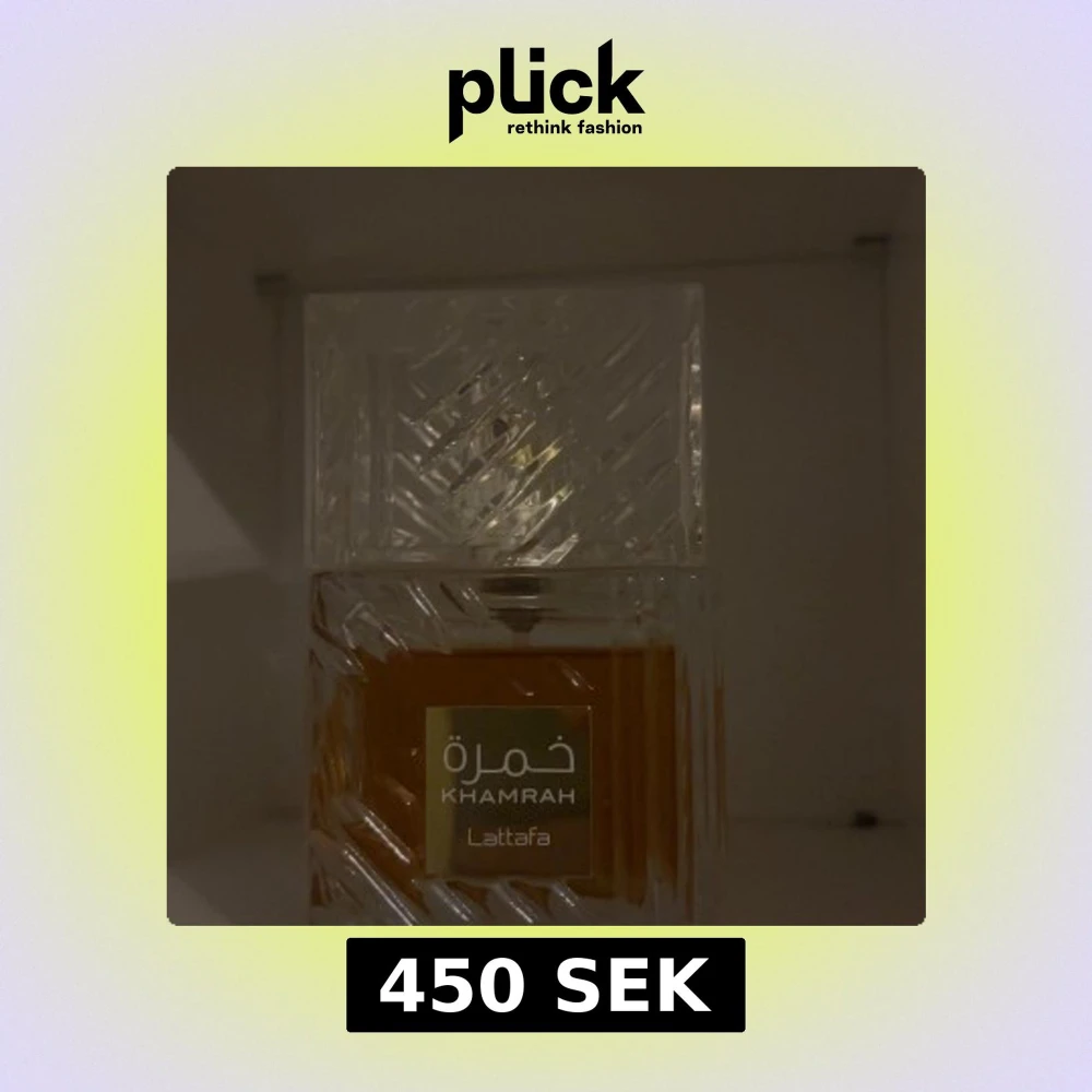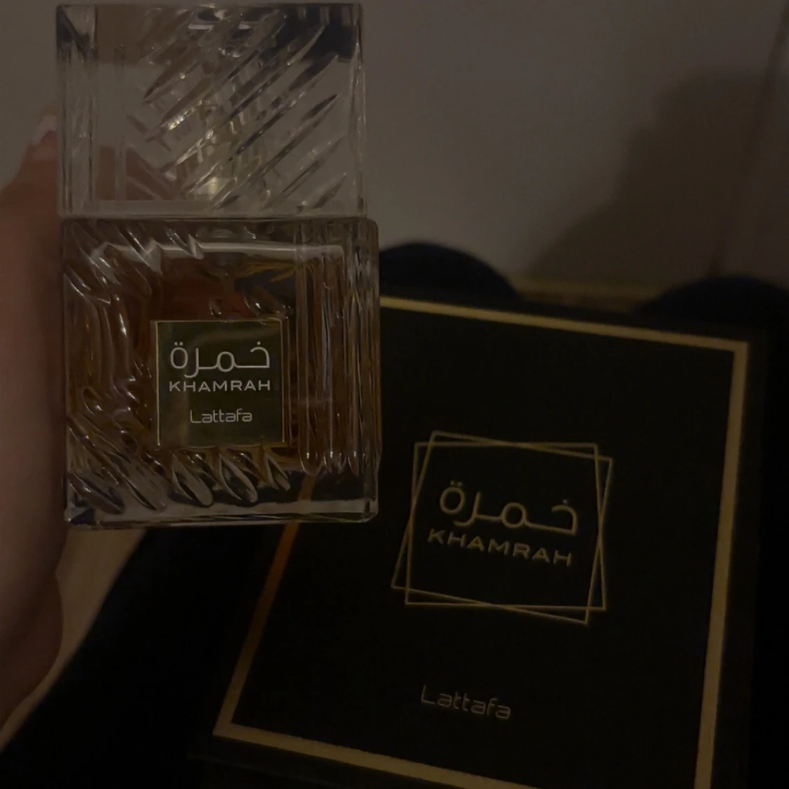 Lattafa Khamrah är en lyxig parfym i en elegant, fyrkantig glasflaska med mönstrad yta och gyllene etikett. Doften kommer i en svart och guld ask som ger exklusiv känsla. Flaskan rymmer 100ml och har en varm bärnstensfärgad vätska.