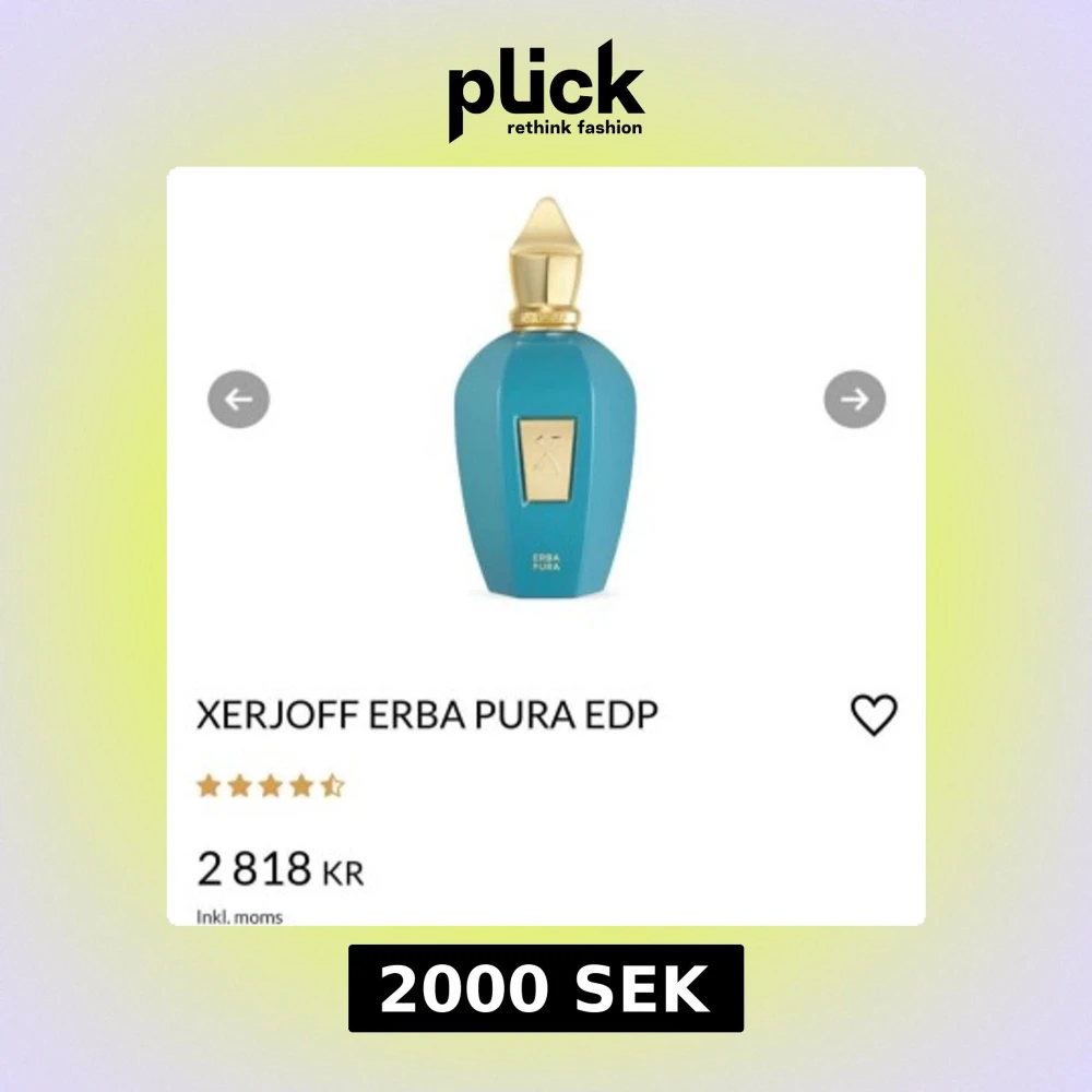 Lyxig parfym från Xerjoff, Erba Pura EDP, i en elegant turkos flaska med guldfärgad kork. Flaskan har en stilren design med märkets logotyp i guld. Perfekt för den som söker en exklusiv doftupplevelse. Xerjoff Erba Pura är en frisk och fruktig doft med en perfekt balans mellan citrus, blommiga och träiga noter. En lätt, upplyftande parfym som passar för både dag och kväll! Toppnoter: Apelsin, bergamott Mellannoter: Jasmin, mysk Basnoter: Amber, vanil!!! De bara hojta till vid intresse!