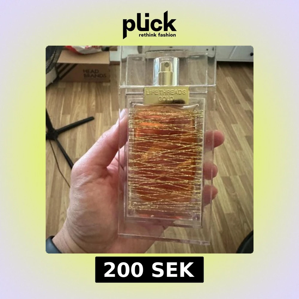 Säljer en exklusiv parfymflaska från Life Threads Gold. Flaskan är rektangulär i genomskinligt glas med guldtrådar lindade runt och en guldfärgad spraydel. Vätskan inuti är bärnstensfärgad och designen känns riktigt lyxig och unik.