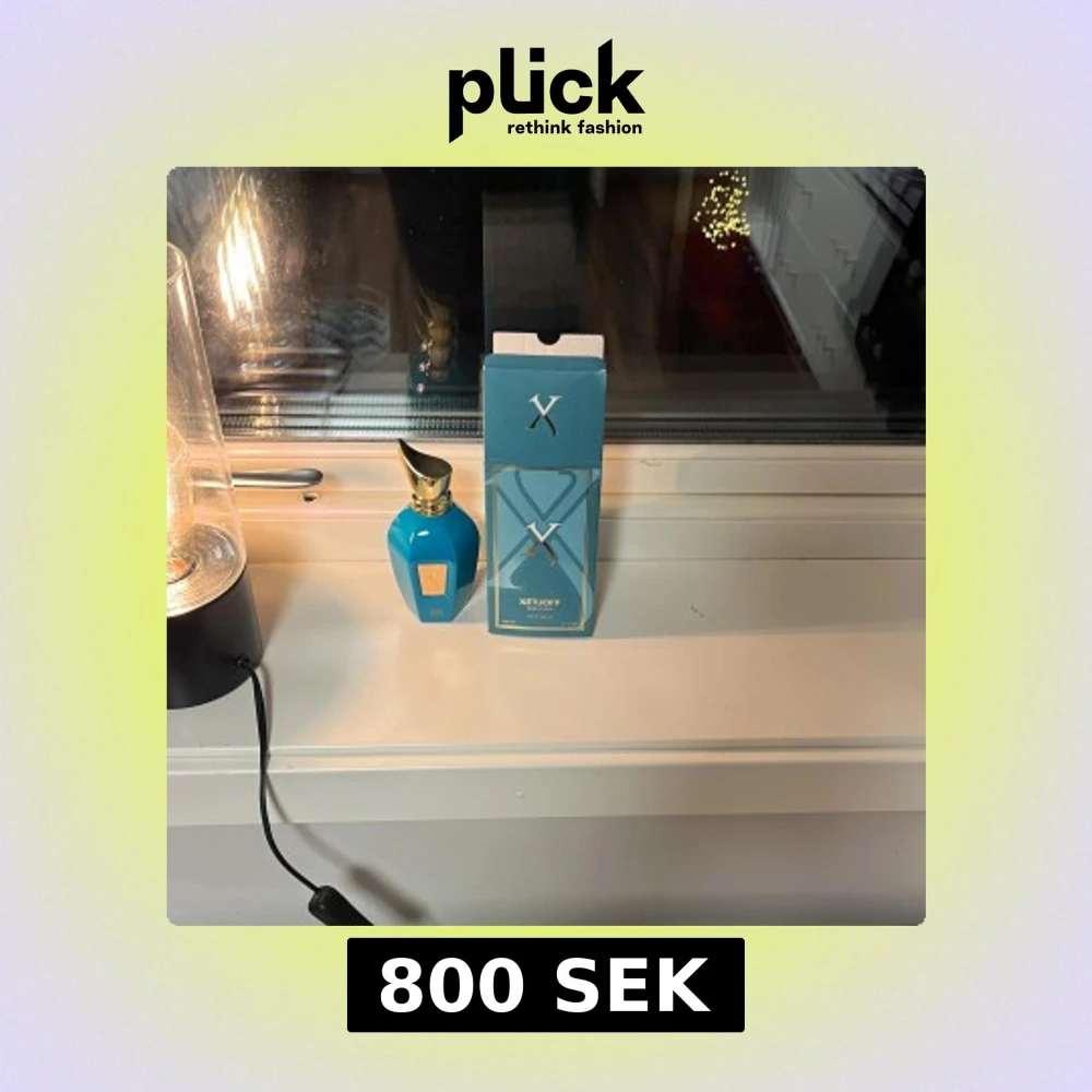 Säljer en elegant blå parfymflaska från Xerjoff med en gyllene kork. Förpackningen är också blå med en stilren design. Perfekt för den som söker en lyxig doftupplevelse. Använd enstaka gånger