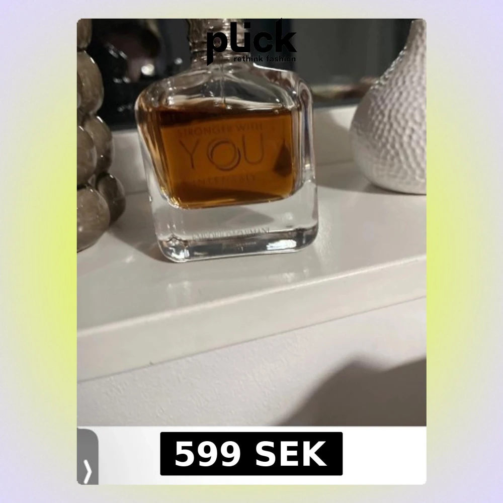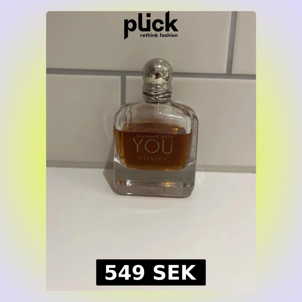 En snygg parfymflaska från Emporio Armani, Stronger With You Intensely. Flaskan är genomskinlig med en fyrkantig form och innehåller en bärnstensfärgad vätska. Perfekt för dig som gillar eleganta och moderna dofter.