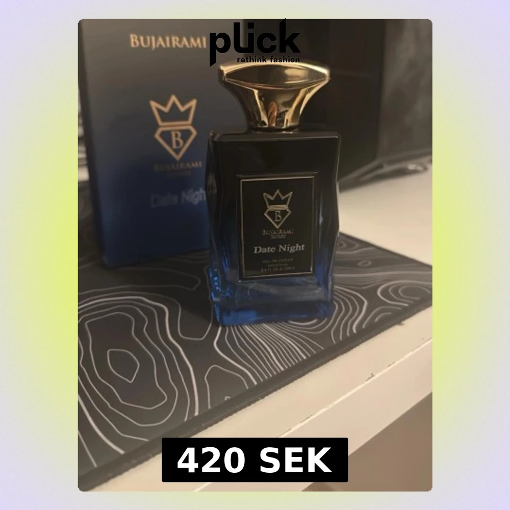 Exklusiv parfym från Bujairami, Date Night, i en elegant mörkblå glasflaska med guldfärgat lock och detaljer. Flaskan rymmer 100 ml och har en lyxig design med svart och guld etikett. Perfekt för dig som vill ha en unik och sofistikerad doft.