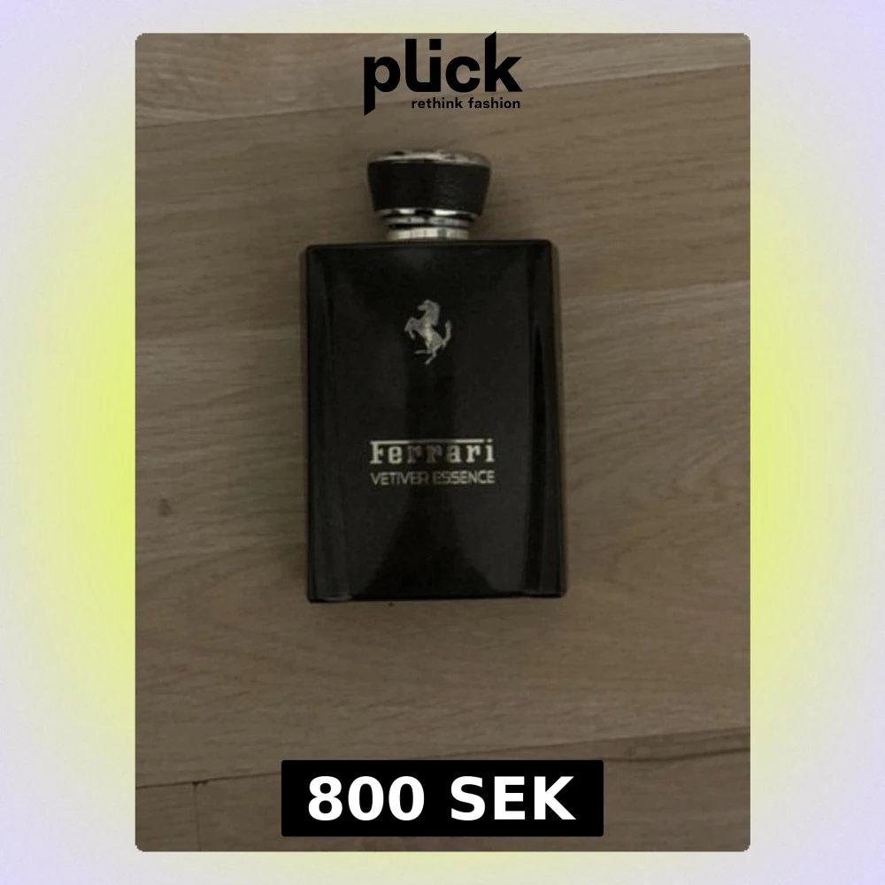 Snygg parfymflaska från Ferrari, Vetiver Essence. Flaskan är mörkgrå med silverdetaljer och har en stilren, fyrkantig form. Märkets ikoniska hästlogga syns tydligt på framsidan och locket är i metall med en elegant finish. Tillverkas inte längre (rare).