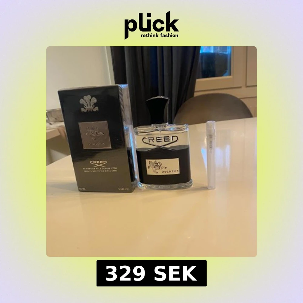Exklusiv Creed Aventus Parfum i en elegant glasflaska med svart och silverdetaljer. Förpackningen är stilren och svart med Creed-logotypen. Perfekt för den som söker en lyxig och tidlös doftupplevelse.