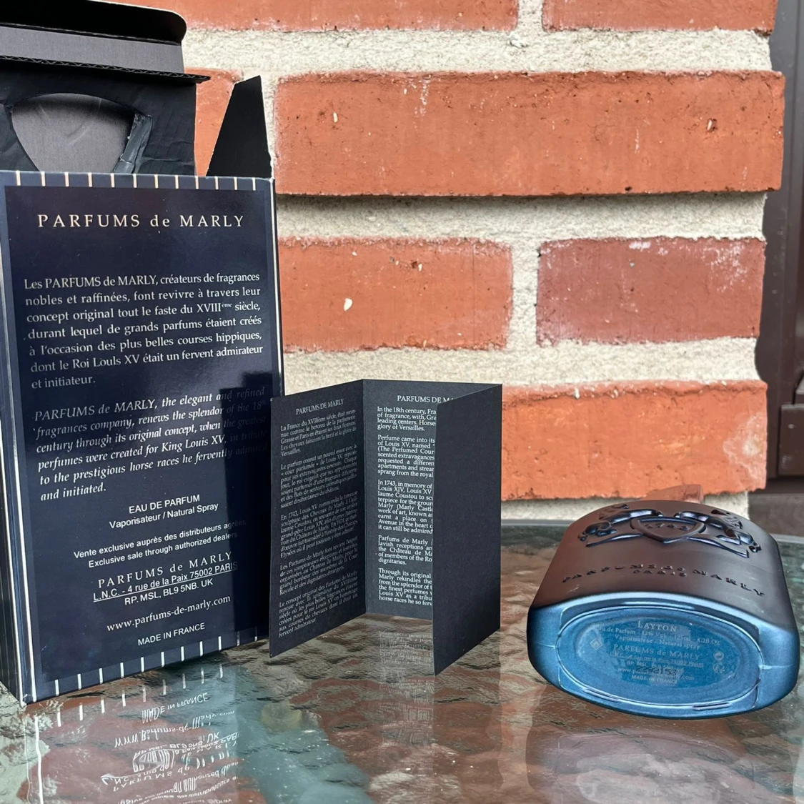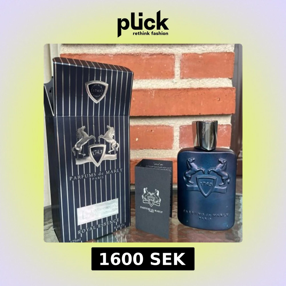 Exklusiv parfym från Parfums de Marly, Layton Royal Essence. Flaskan är mörkblå med silverdetaljer och har en stilren, maskulin design med två upphöjda hästar och sköld. Kommer i originalförpackning med tillhörande informationshäfte. Volym: 125 ml. priset ej hugget i sten vid snabbaffär