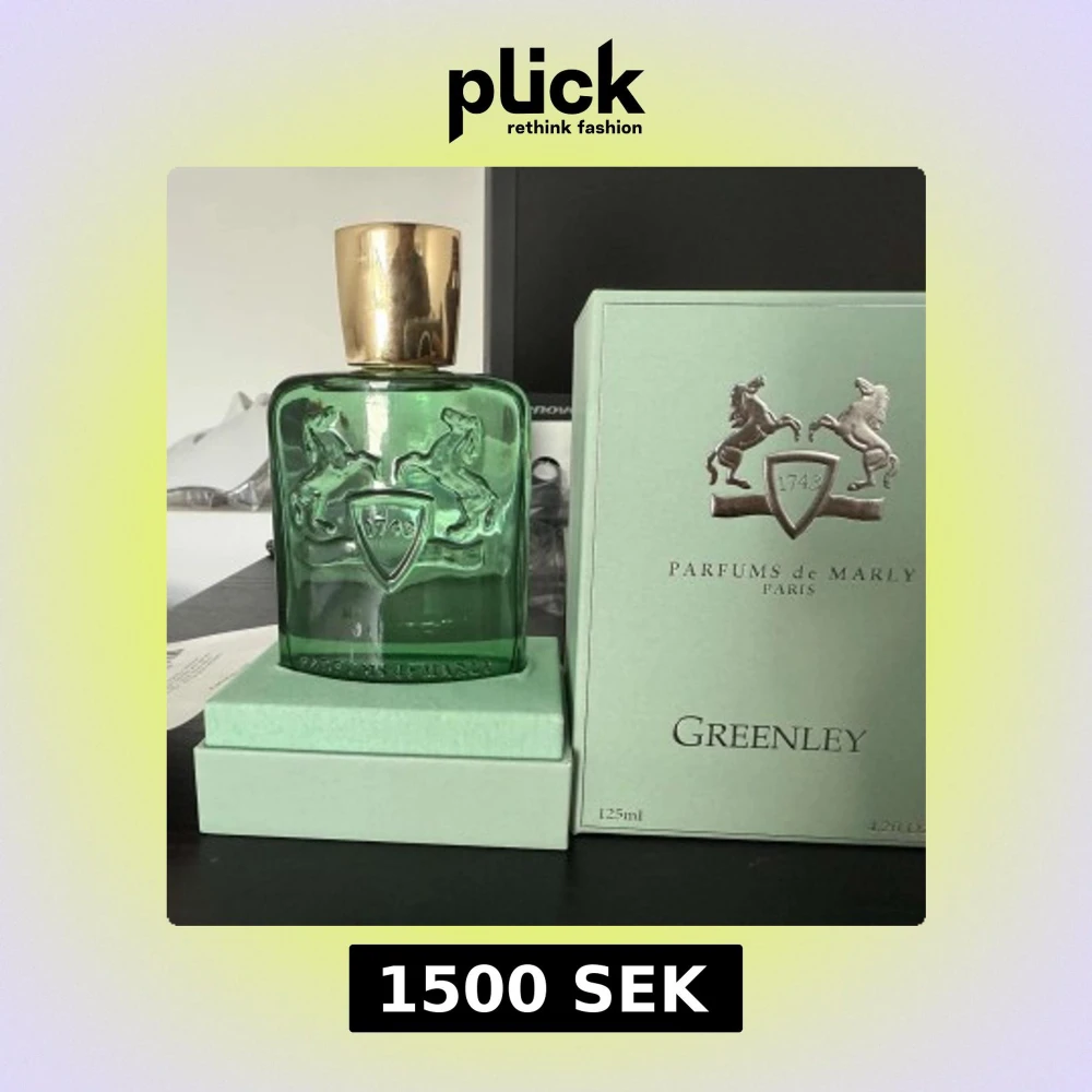 Greenley från Parfums de Marly är en exklusiv parfym i en stilren ljusgrön kartong med silverdetaljer och logotyp med två hästar. Flaskan rymmer 125 ml och doften är känd för sin fräscha och grönskande karaktär.