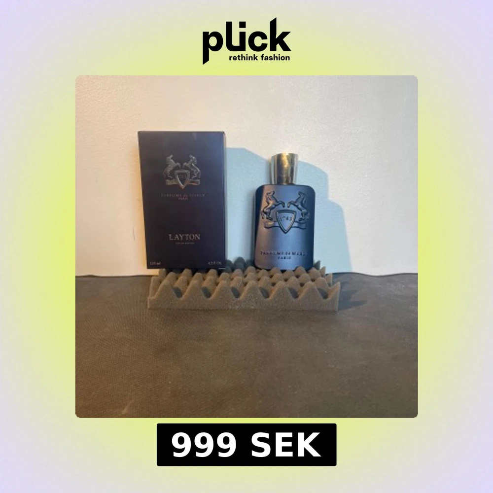 Lyxig parfym från Parfums de Marly, Layton Eau de Parfum i 125 ml flaska. Flaskan är matt mörkblå med silverdetaljer och ett elegant emblem med två hästar. Kommer med originalkartong i matchande mörkblå färg och silvertext. Perfekt för dig som gillar exklusiva dofter. Aldrig använd