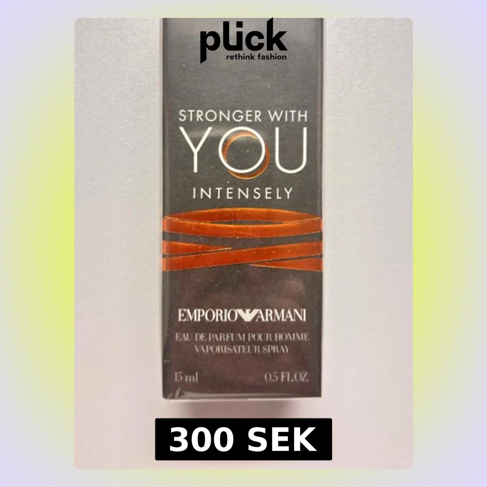 Emporio Armani Stronger With You Intensely Eau de Parfum pour Homme i 15 ml flaska. Förpackningen är mörkgrå med kopparfärgade detaljer och vit text. Parfymen kommer i en stilren och lyxig kartong, perfekt för dig som gillar exklusiva dofter. Perfekt för efter idrott.
