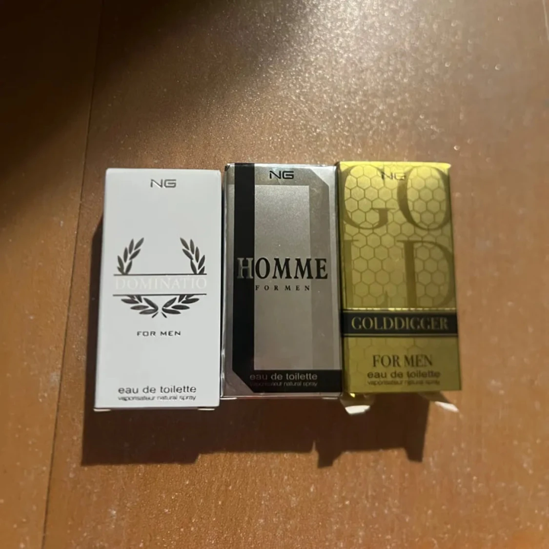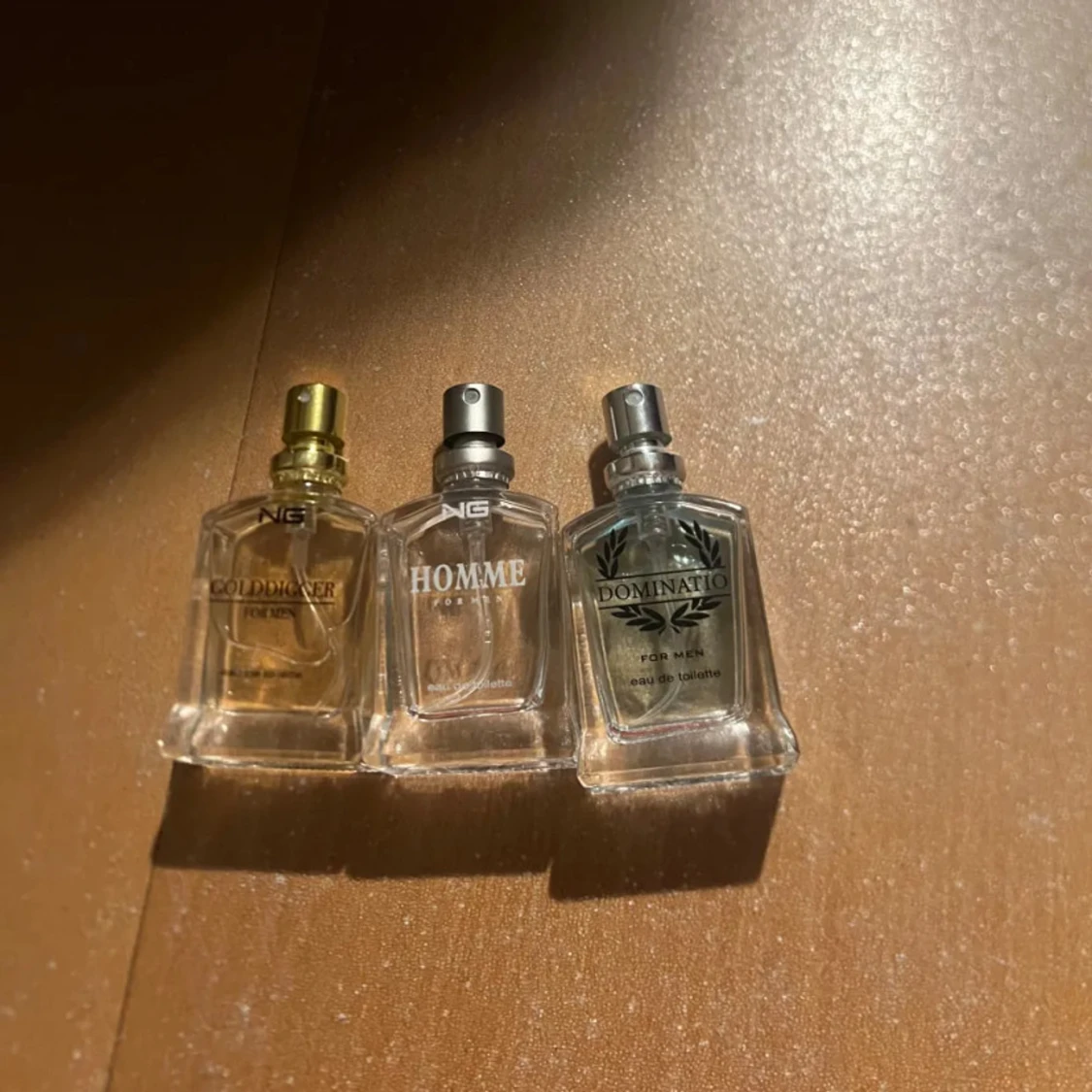 Säljer tre olika parfymer från NG: Gold Digger med gyllene detaljer, Homme med silverdetaljer och Dominator med mörka detaljer. Alla flaskor är små och rektangulära med en elegant design. Perfekt för den som vill ha variation i sin doftsamling.