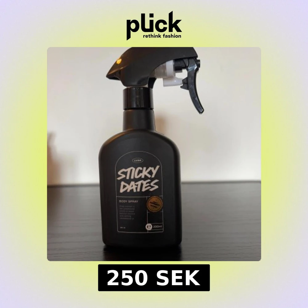 En svart sprayflaska med doften Sticky Dates från Lush. Flaskan rymmer 200 ml och har en modern, matt finish med vit text på etiketten. Perfekt för dig som gillar söta och unika dofter. RESERVERAD