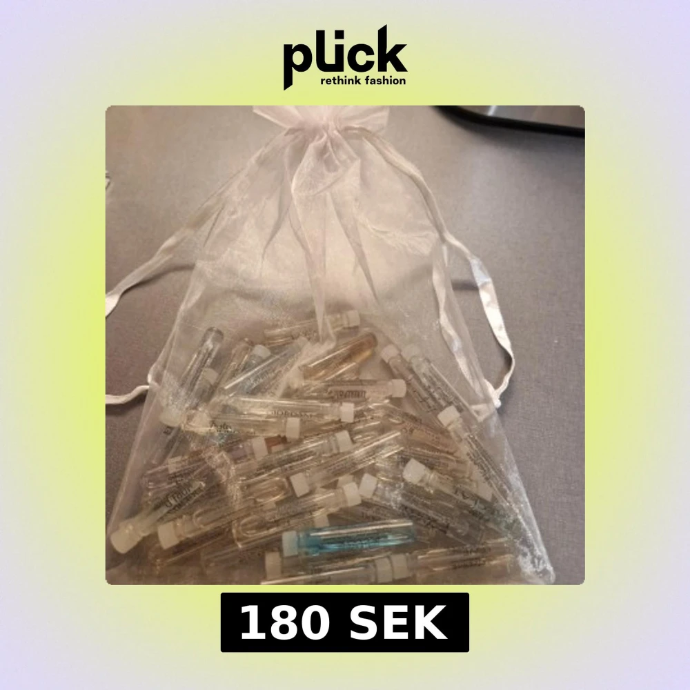 En stor samling av parfymprover i en elegant organzapåse. Proverna kommer i små glasflaskor med vita lock, perfekt för att testa olika dofter. Påsen är genomskinlig och knyts med ett band. 1ml alla ca hälften kvar, blandat för dam och herr.