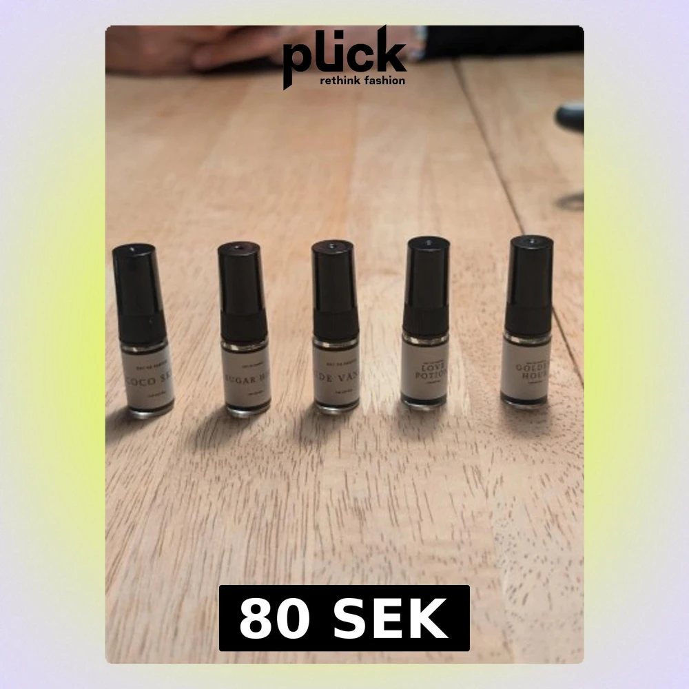 Set med fem små parfymprover från Curiosa i dofterna Coco Skin(Utopia vanilla Coco), Sugar High, nude Vanilla(Billie Eilish no1), Love Potion och Golden Hour(Naxos Golden Hour). 2ml i varje flaska, men har testats. Nude vanilla har 1 ml kvar men i de andra är det mer. Kolla gärna min profil, jag har fler parfymer.