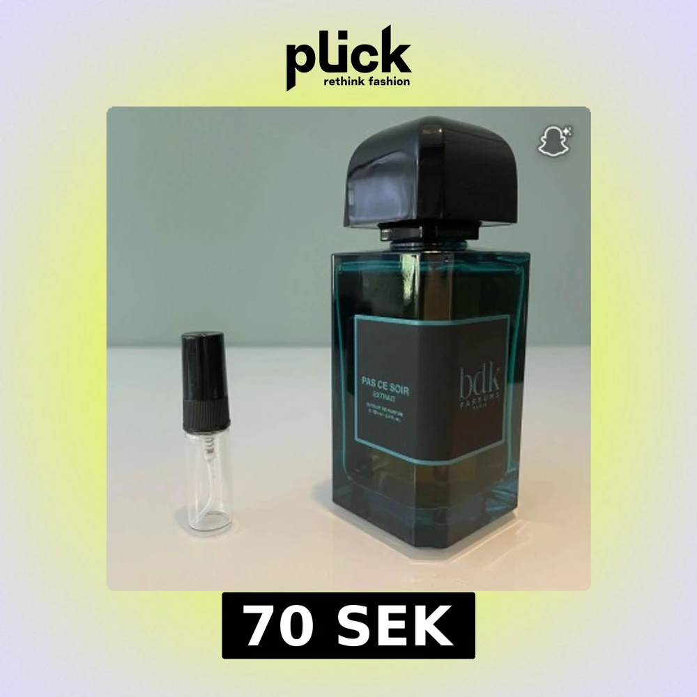 Ett sample på 2 ml av BDK Pas Ce Soir Extrait. Det är en frisk året runt parfym med noter som päron, ingefära, vita blommor och en vanilj i basen som gör den utmärkt för både sommar och vinter. Våra samples är helt nya och gjorda av glas. Det är fritt fram att skriva till oss om ni har frågor!