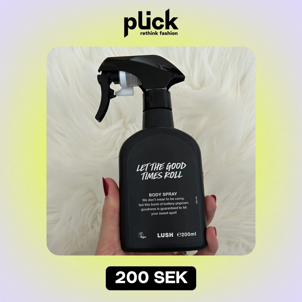 Säljer en 200 ml body spray från Lush med namnet 'Let The Good Times Roll'. Den har en söt och smörig popcorn-doft som verkligen sticker ut. Perfekt för dig som vill ha en unik och rolig doftupplevelse. Flaskan är svart med en praktisk sprayfunktion.