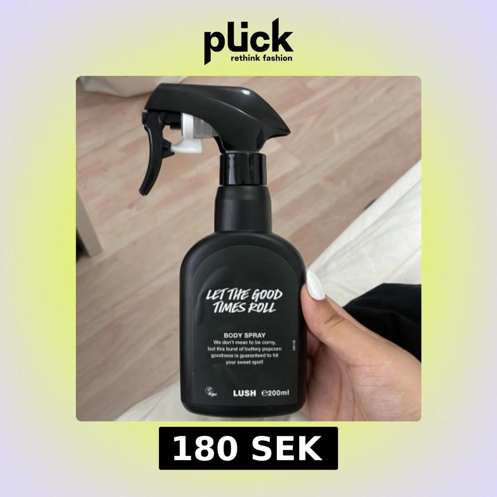 En svart sprayflaska med lite mer än hälften i body spray från Lush, Let The Good Times Roll. Doften beskrivs som en söt och smörig popcornupplevelse. Flaskan har en modern, matt finish och tydlig vit text på framsidan. Vegansk och tillverkad i England.