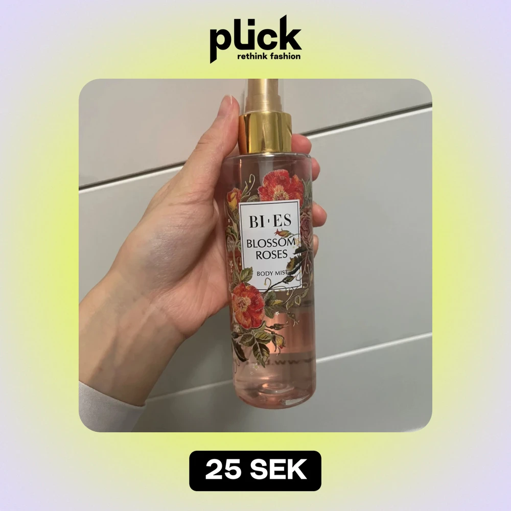 Säljer en body mist från Bi-Es med doften Blossom Roses. Flaskan är genomskinlig med ett vackert blommönster i rött och grönt. Den har en guldig spraytopp som ger en lyxig känsla. Perfekt för att fräscha upp sig under dagen! 🌹✨