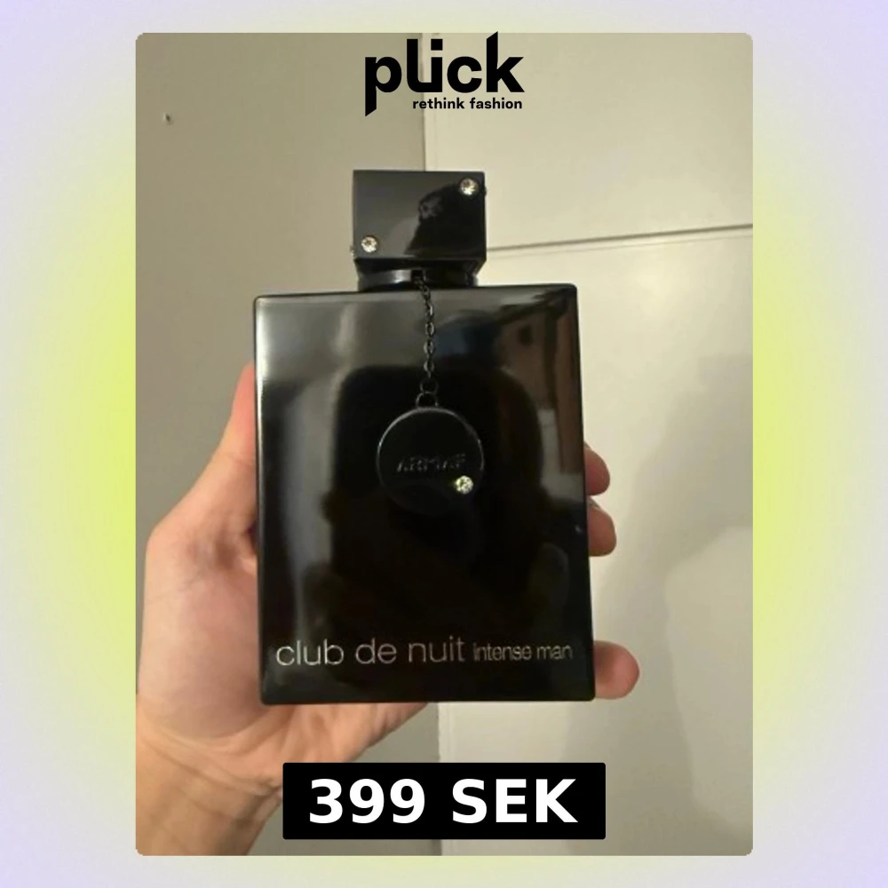 En stilren och maskulin parfymflaska från Armaf, Club de Nuit Intense Man. Flaskan är svart med en fyrkantig form och har en dekorativ kedja med en rund bricka. Texten är i silver och designen känns lyxig och modern. Oanvänd bara testad.