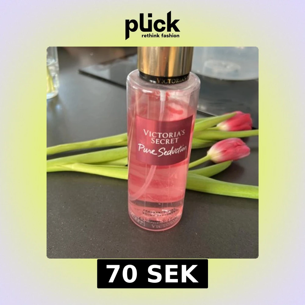 Säljer en Victoria's Secret Pure Seduction Fragrance Mist med en doft av saftig plommon och krossad fresia. Flaskan är genomskinlig med rosa vätska och har en gyllene kork. Perfekt för att fräscha upp din dag med en söt och blommig doft.