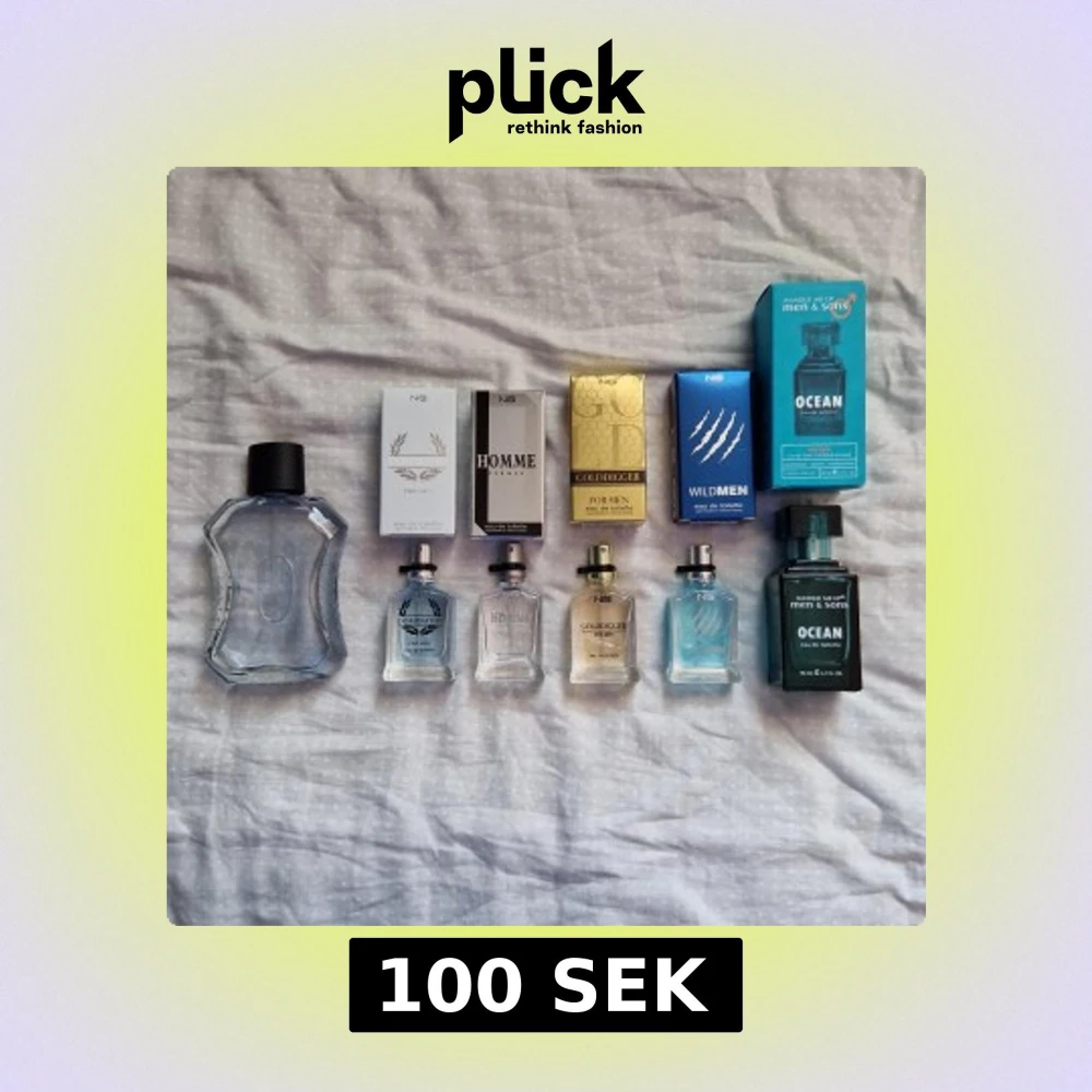 Säljer ett set med herrparfymer från NG och Masque Me Up. Inkluderar dofter som Dominatio, Homme, Golddigger, Wildmen och Ocean. Flaskorna är i glas med olika former och färger, från transparent till blå och guld. Perfekt för dig som vill testa olika dofter.
