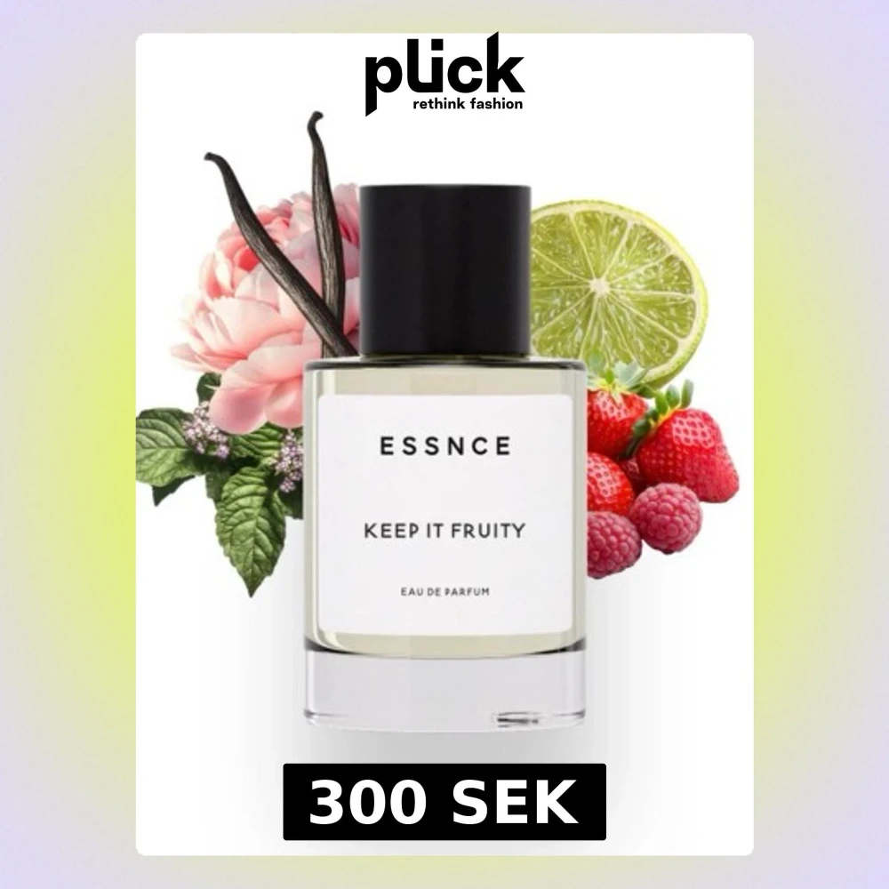 Fräsch parfym från ESSNCE med namnet Keep It Fruity. Doften har tydliga inslag av lime, vanilj, hallon och jordgubb, samt blommiga toner. Flaskan är genomskinlig med svart lock och minimalistisk vit etikett. Perfekt för dig som gillar fruktiga och söta dofter.