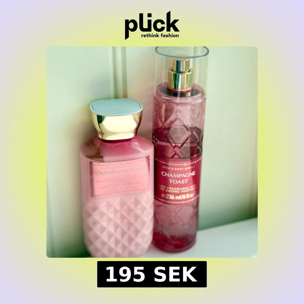 Bath & Body Works Champagne Toast Bodymist och Body Lotion, båda på 236 ml. Använt enligt bild. Givetvis förvarat mörkt och svalt.