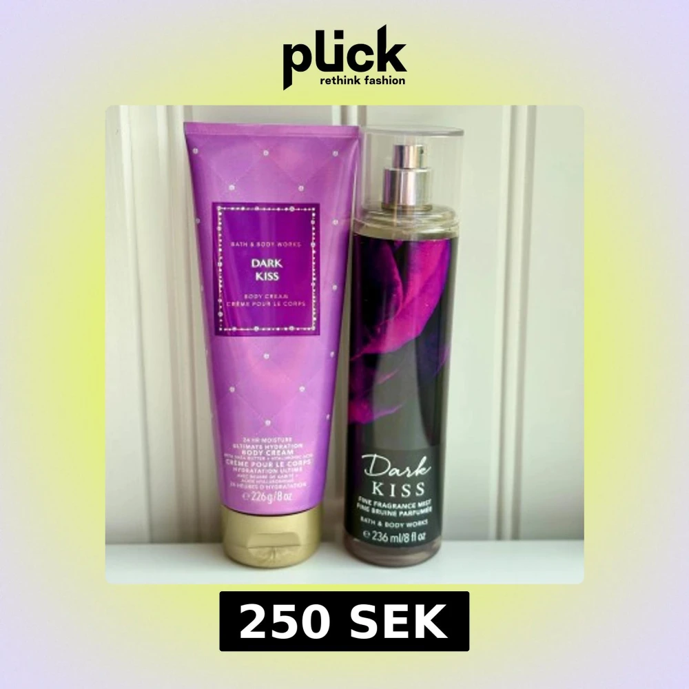 Bath & Body Works set med Dark Kiss Fine Fragrance Mist (236 ml) och Body Cream (226 g). Använd enligt bild (bodymist). Krämen är enbart testad ett par gånger. Givetvis förvarad mörkt och svalt.
