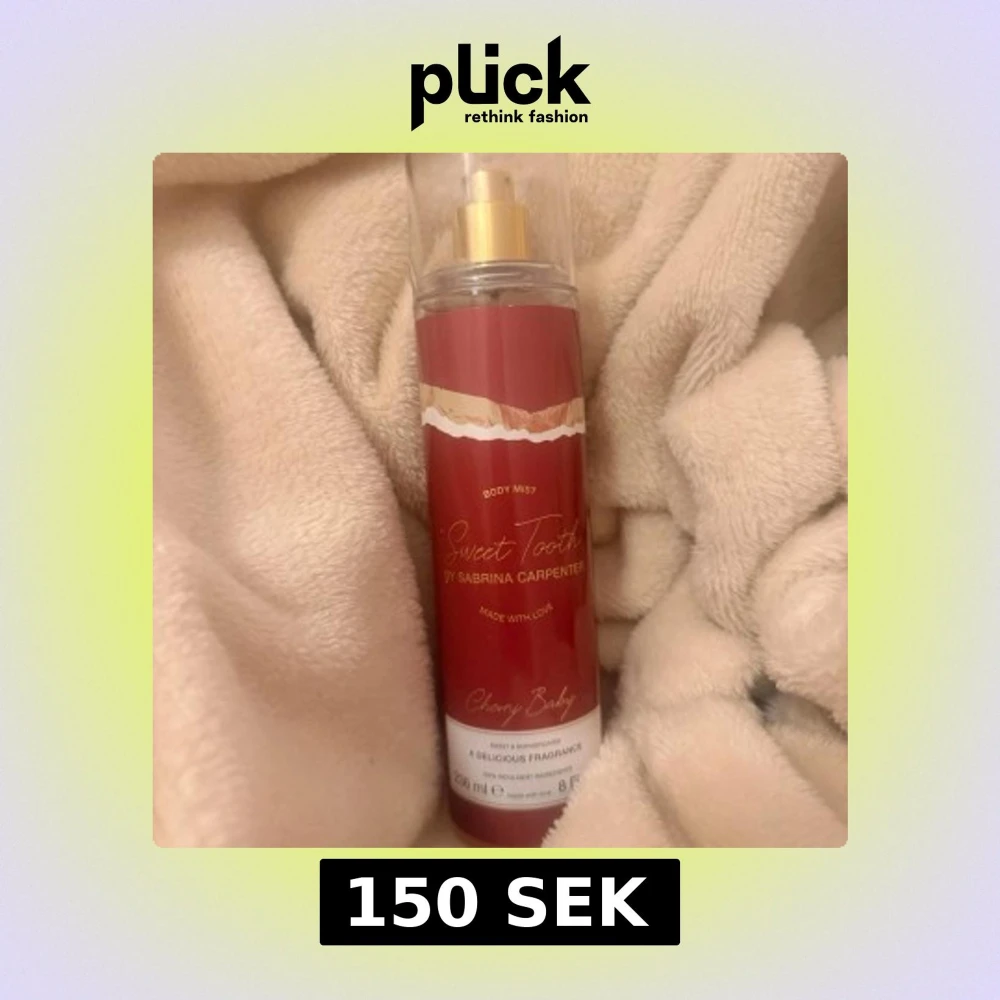 En body mist från Sabrina Carpenter, Sweet Tooth Cherry Baby. Doften är fruktig och söt, perfekt för dig som gillar bäriga toner. 236 ml.🍒🩶 använd ungefär 3-4 gånger mycket kvar!