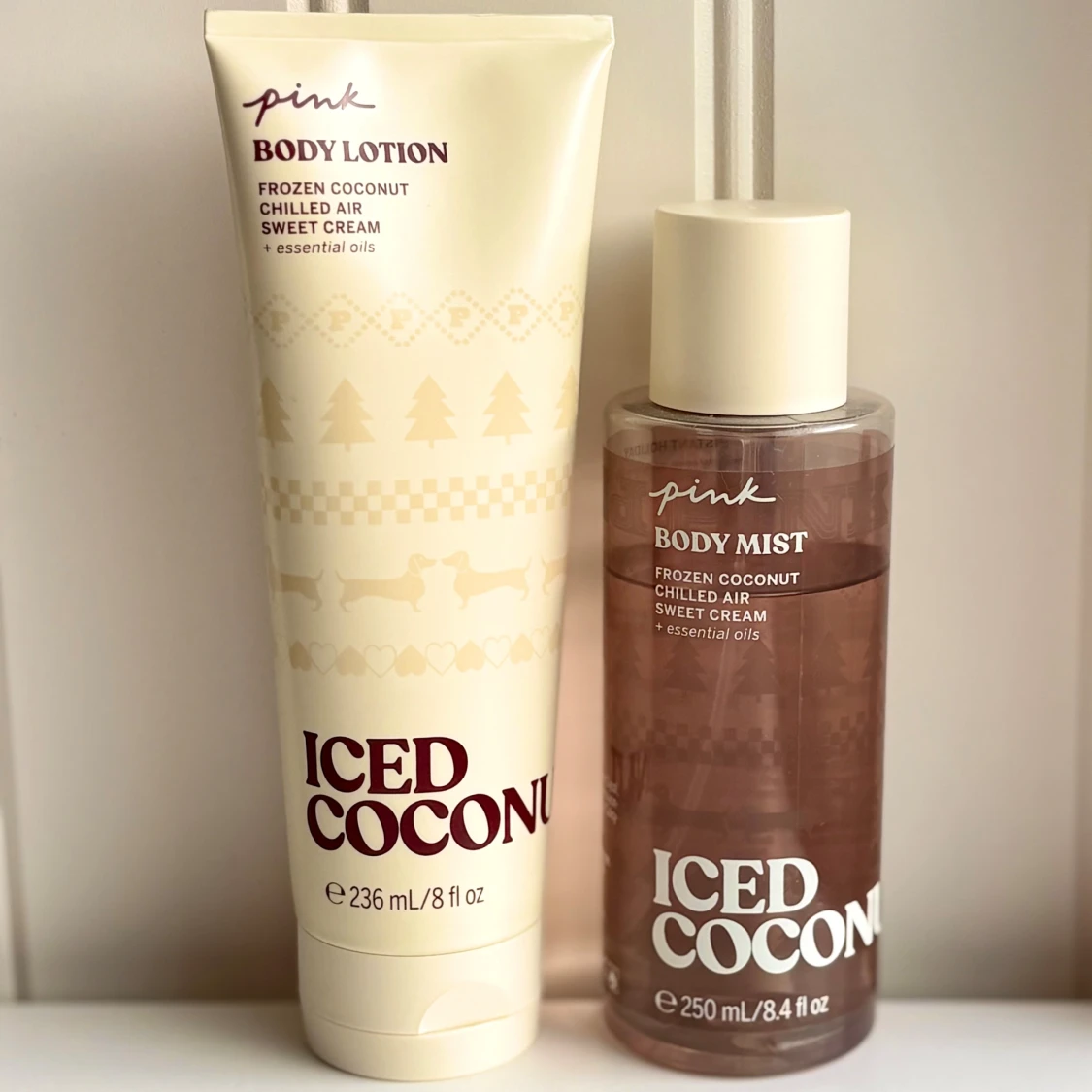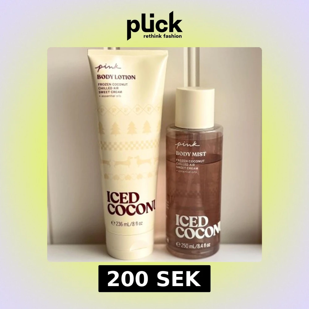 Från Victoria’s Secret PINK. Ett set med body mist (250 ml) och body lotion (236 ml) i doften Iced Coconut. Mist använd enligt bild. Lotion enbart testad.
