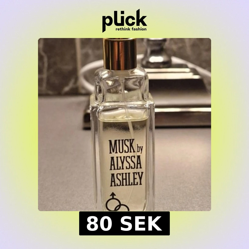 Elegant parfymflaska med en klassisk doft av musk från Alyssa Ashley. Flaskan är genomskinlig med svart text och en gyllene kork. Perfekt för den som älskar tidlösa och sofistikerade dofter. Se bild för mängd som är kvar. Utan kork.