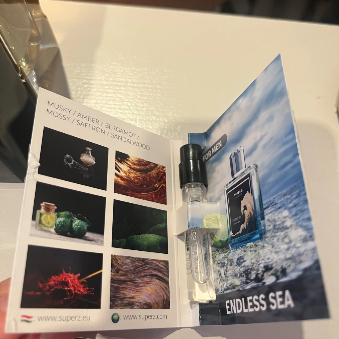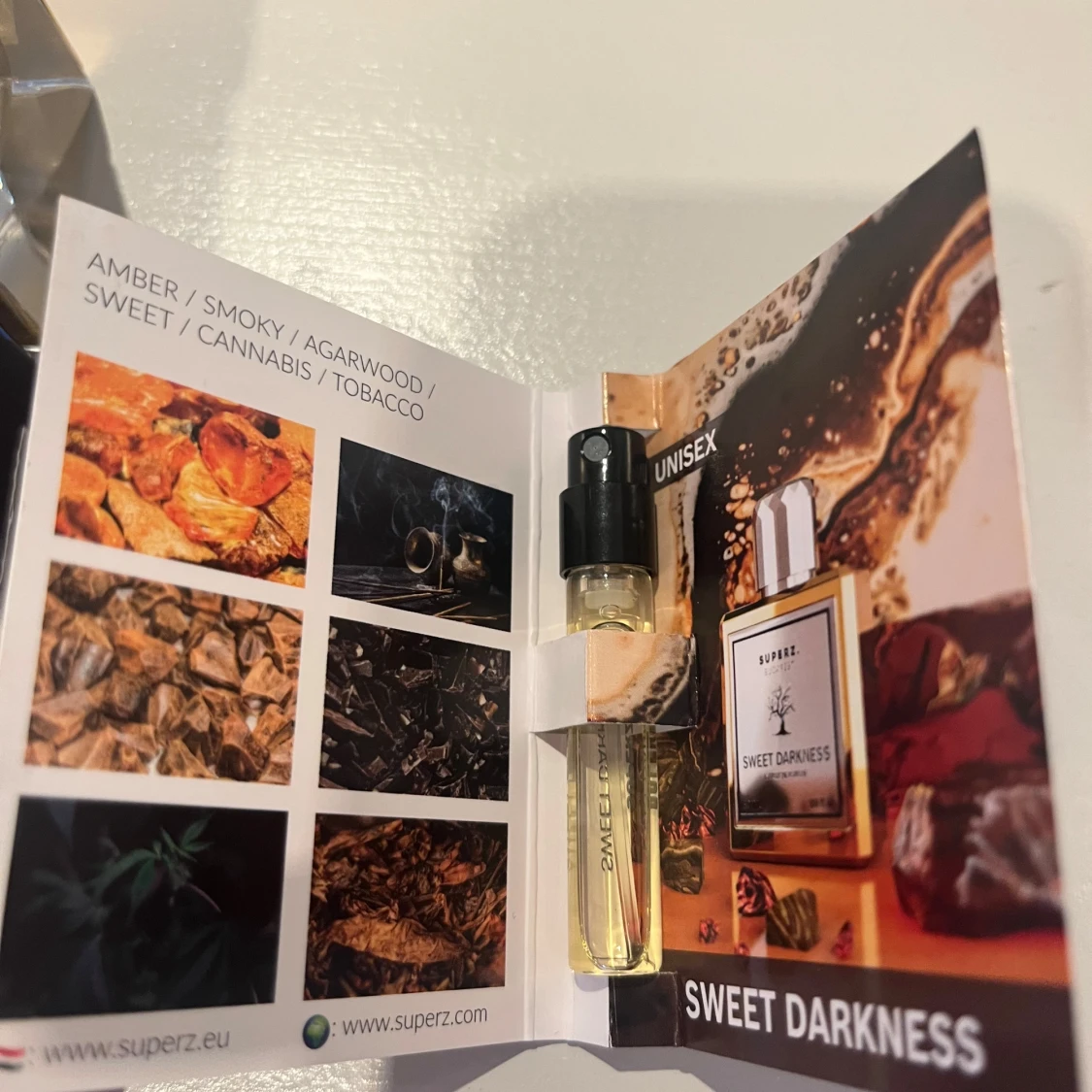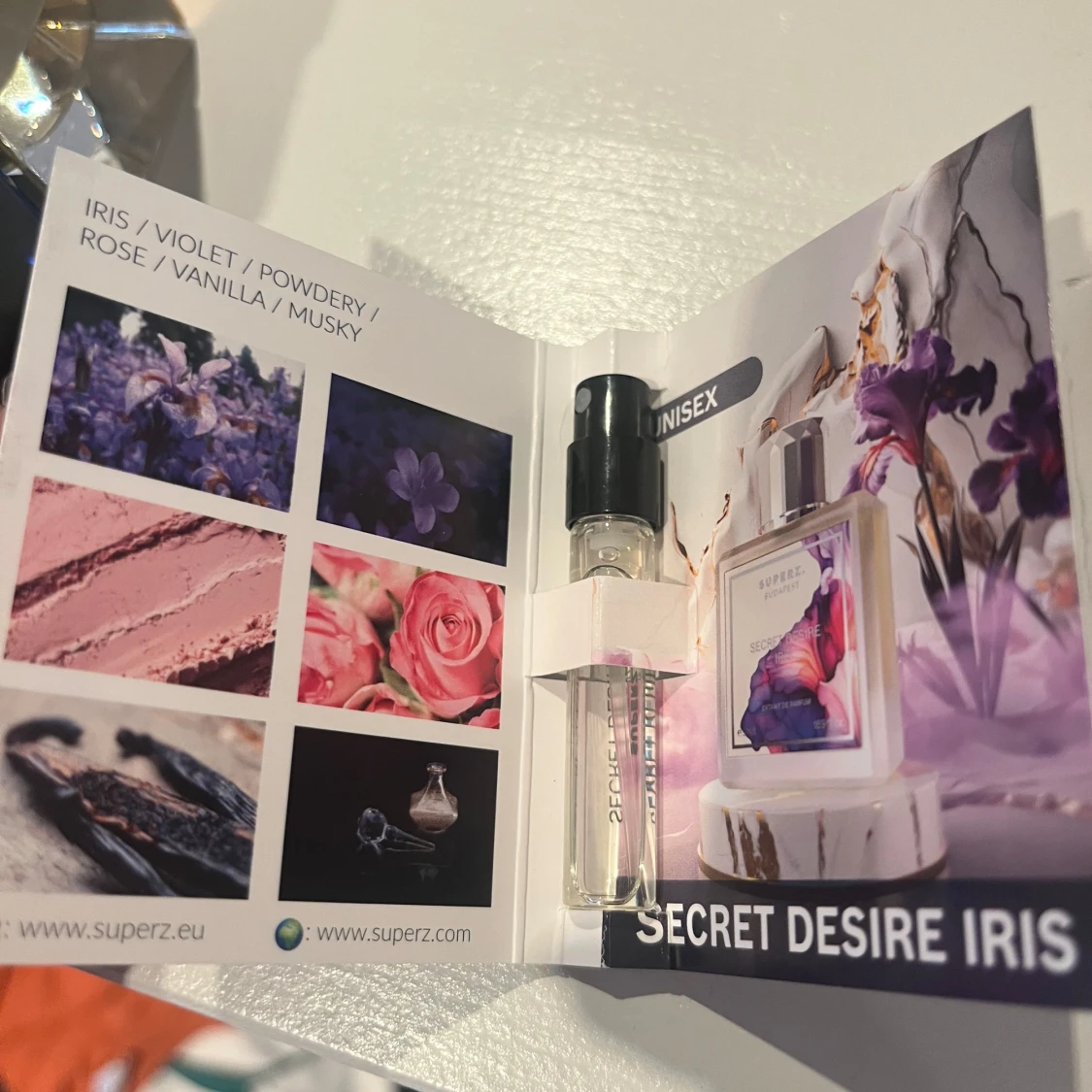 Säljer tre exklusiva parfymprover från Superz Budapest: Secret Desire Iris (iris, viol, ros, vanilj, mysk), Sweet Darkness (amber, rökig, agarträ, cannabis, tobak) och Endless Sea (musk, amber, bergamott, saffran, sandelträ). Alla i smidiga 2ml sprayflaskor.