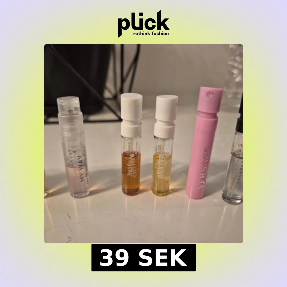 Säljer ett set med parfymprover från flera kända märken som Versace, Jean Paul Gaultier, Escada och Ariana Grande. Proverna kommer i små glasflaskor med spray eller skruvkork, vissa med färgad vätska och andra genomskinliga. Perfekt för dig som vill testa nya dofter. Karl lagerfeld Hugo boss Alive VR good fortune Escada celebrate Escada celebrate life Ariana grande moonlight Armani My way Jean paul Jean paul gaulter divine Versace bright crystal Marc jacobs decadence
