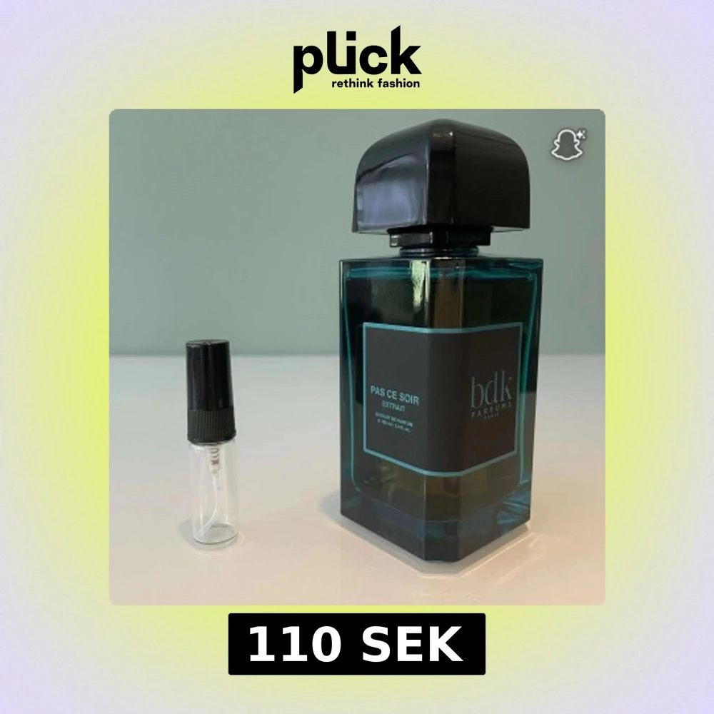 Ett sample på 3 ml av BDK Pas Ce Soir Extrait. Det är en frisk året runt parfym med noter som päron, ingefära, vita blommor och en vanilj i basen som gör den utmärkt för både sommar och vinter. Våra samples är helt nya och gjorda av glas. Det är fritt fram att skriva till oss om ni har frågor!