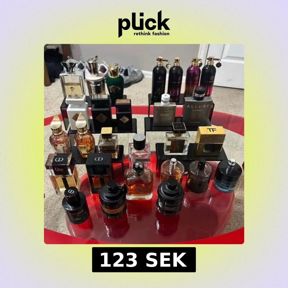 Stor samling parfymer från lyxiga märken som Dior, Tom Ford, Chanel och YSL. Flaskorna har olika former och färger, från eleganta glasflaskor i guld, svart och bärnstensfärgat till moderna, stilrena designer. Perfekt för dig som vill ha variation och testa olika dofter.