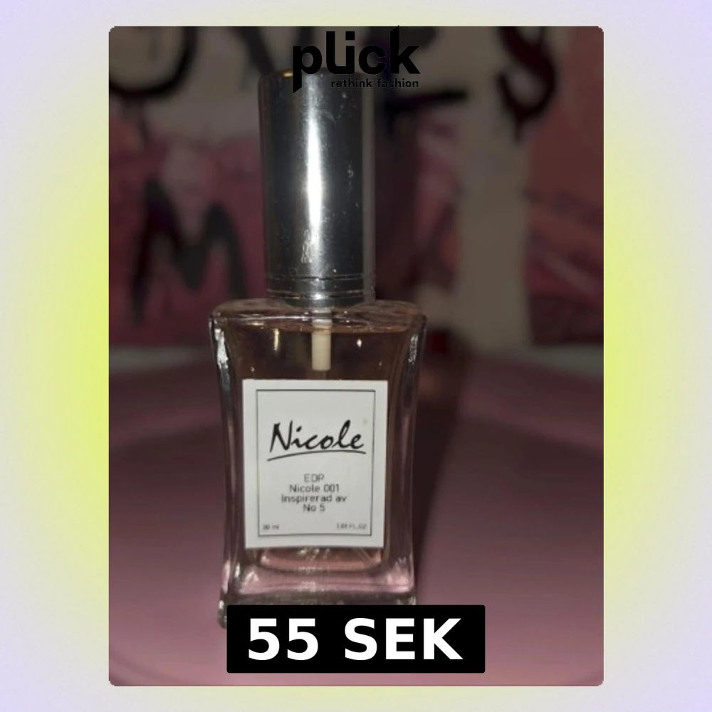 Nicole 001 Eau de Parfum är en parfym inspirerad av No 5. Flaskan är rektangulär i genomskinligt glas med en silverfärgad kork och vit etikett. Doften är elegant och klassisk, perfekt för dig som gillar ikoniska parfymer.